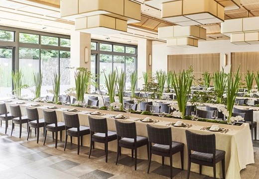 個性豊かな4つの会場は、すべてワンフロア貸切。建物3階にある『SORANIWA』はガラス張りの天井から空を臨む、開放感抜群のバンケット。壁もガラス張りで、窓からは緑が心地良いガーデンを見渡せます。ウッドと上品なオフホワイトを基調とした2階の『KEYAKI』は、アットホームな結婚式におすすめ。ホテルのシンボルツリーである大きなケヤキの木が佇むガーデンテラスを備えています。同フロアにあるウッドテイストの『MORI』では、テラスの屋外キッチンを使ってBBQなど多彩な演出が可能。また、窓から本格的な日本庭園を見渡す1階の『ONDEN』は、伝統とモダンが融合した上質な空間です。