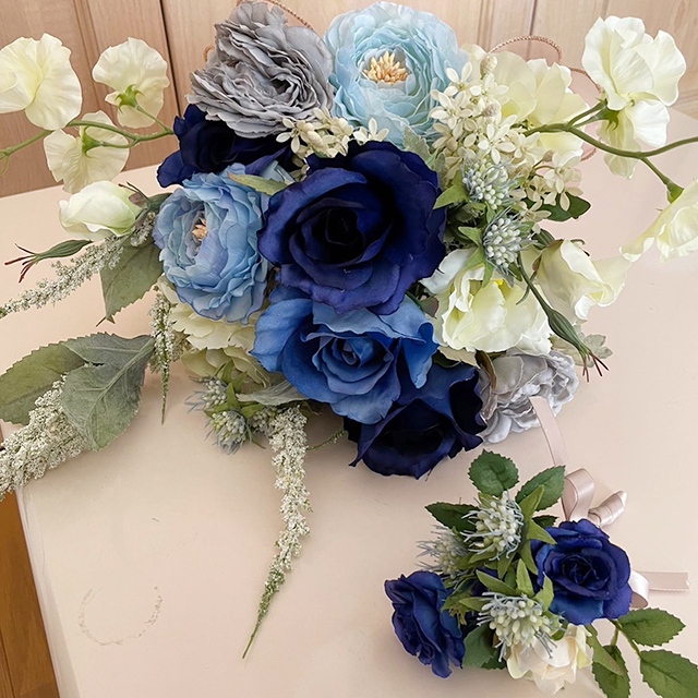 青と白のコントラストが美しいブーケ