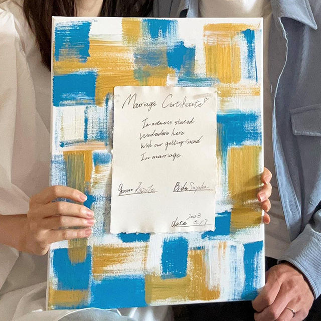 完成したキャンバスは、結婚証明書として挙式中にお披露目したり、披露宴会場に飾ったりすることが多いよう。