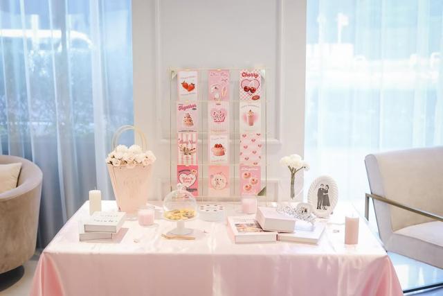 ベージュの大きな布を敷いた上に、シアーなピンクの布をプラス。