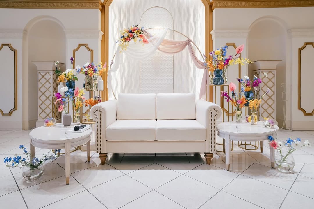 高砂ソファ装花𓂃 𓈒𓏸 . 装花はアネモネっぽいガーベラと アンスリウムを入れてもらうことと、 カラフルで色んな形の花瓶を 使ってもらうことを指定して、 あとは、ピョンピョンしているお花を 装花担当者さんのセンスにお任せしました🙏💐 装花指示書 を作って、 自分の好きなイメージを共有していたので、 理想通りの可愛い装花になって大満足です🙆♀️💯