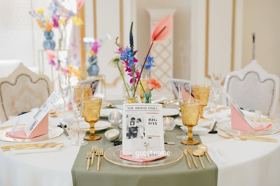テーブルコーディネート𓂃 𓈒𓏸 . 白のクロス🤍 グリーンのテーブルランナー サーモンピンクのナフキン カトラリーはゴールド 飾り皿はクリア♡ お子様ゲストにはキッズメニュー、 ダーズンローズ のお手伝いを お願いしたいゲストの席には、 リクエストカードを 置いてもらってサプライズ🌹