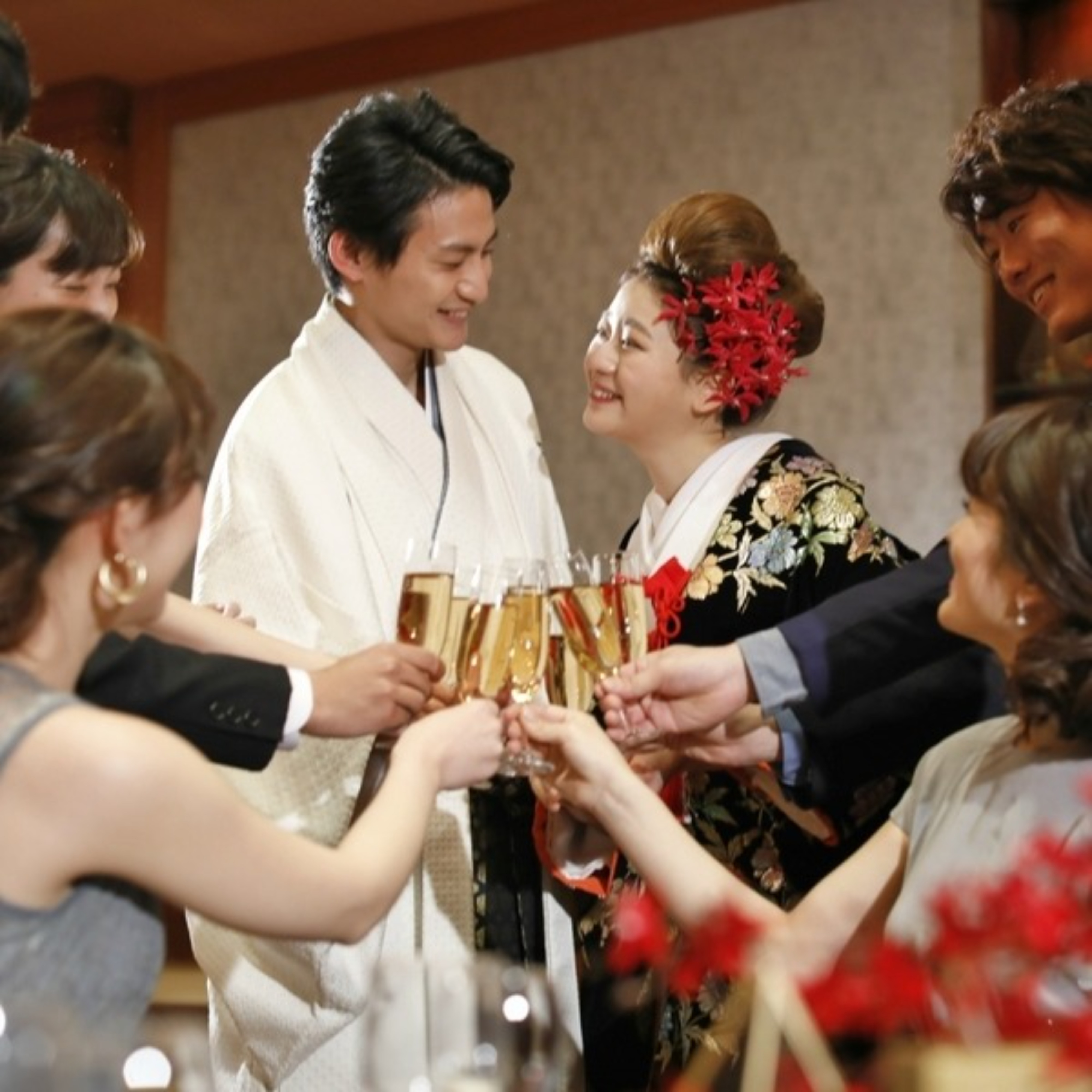 伝統的な神前式を希望するふたりには、格調高い総檜造りの神殿を用意。縁結びの神様とされる出雲大社の御霊が祀られ、東海三県のホテルでは最大級の規模を誇ります。凛とした空気の中、一生の思い出に残る厳かな神前式が叶います。
