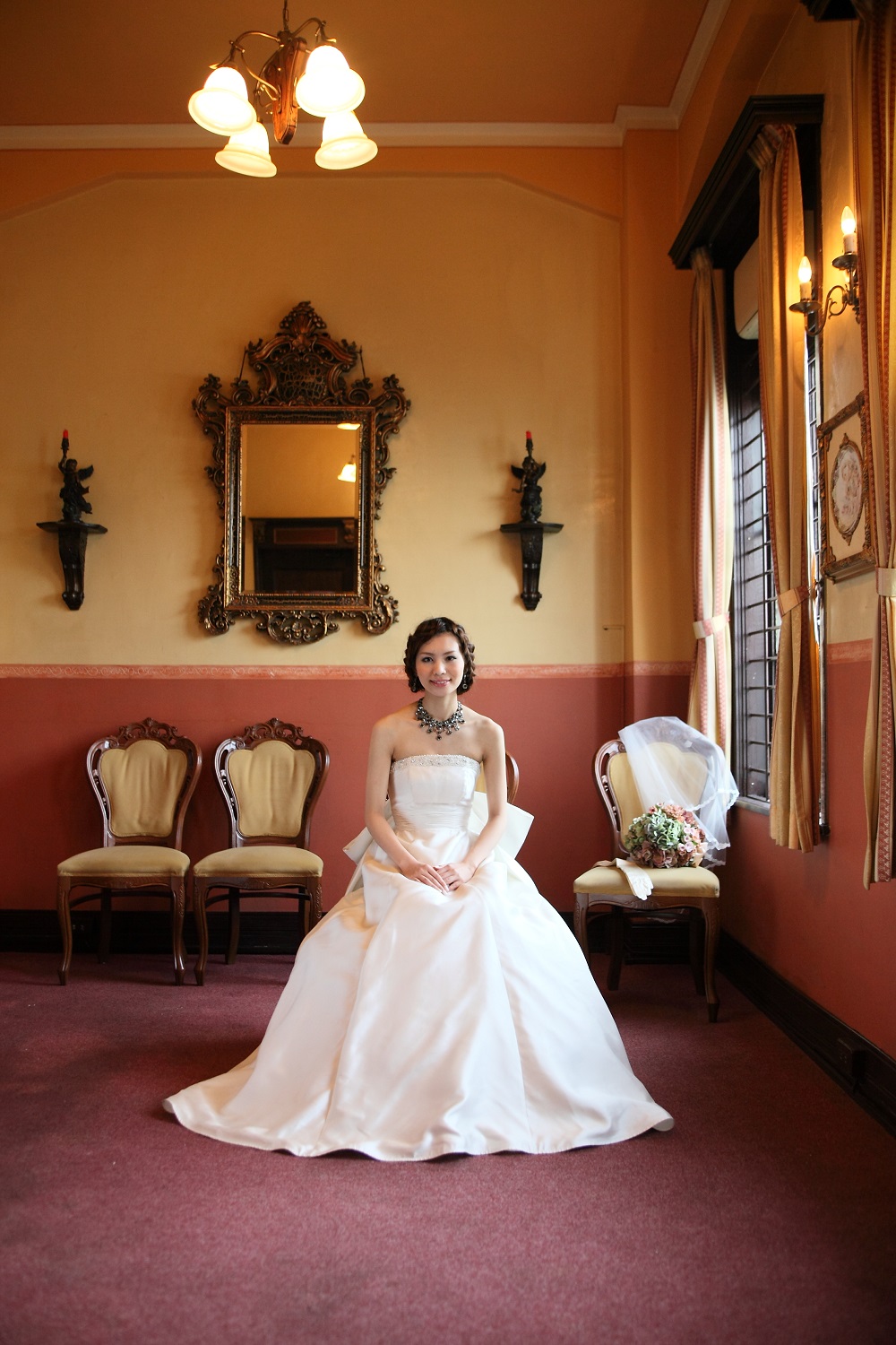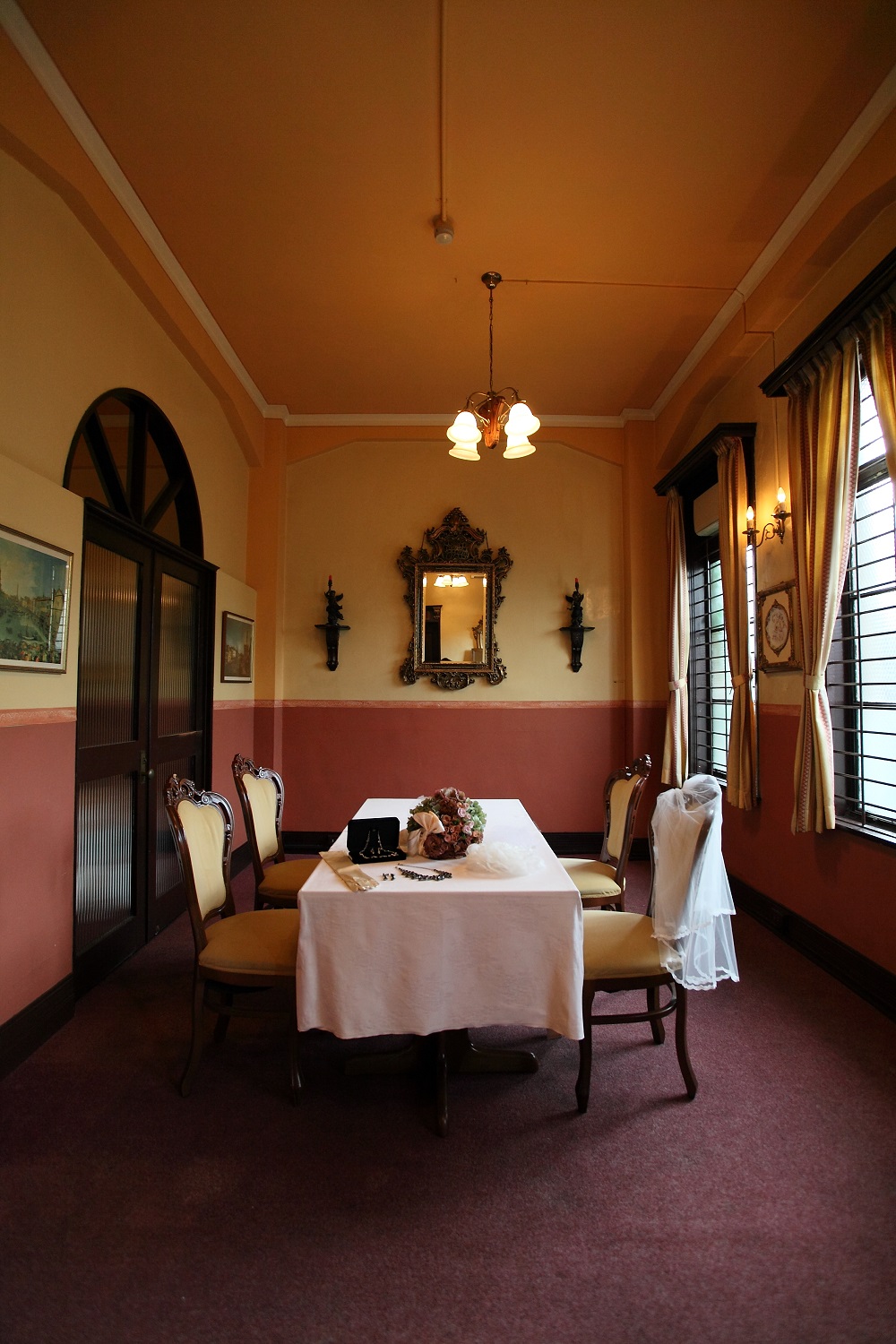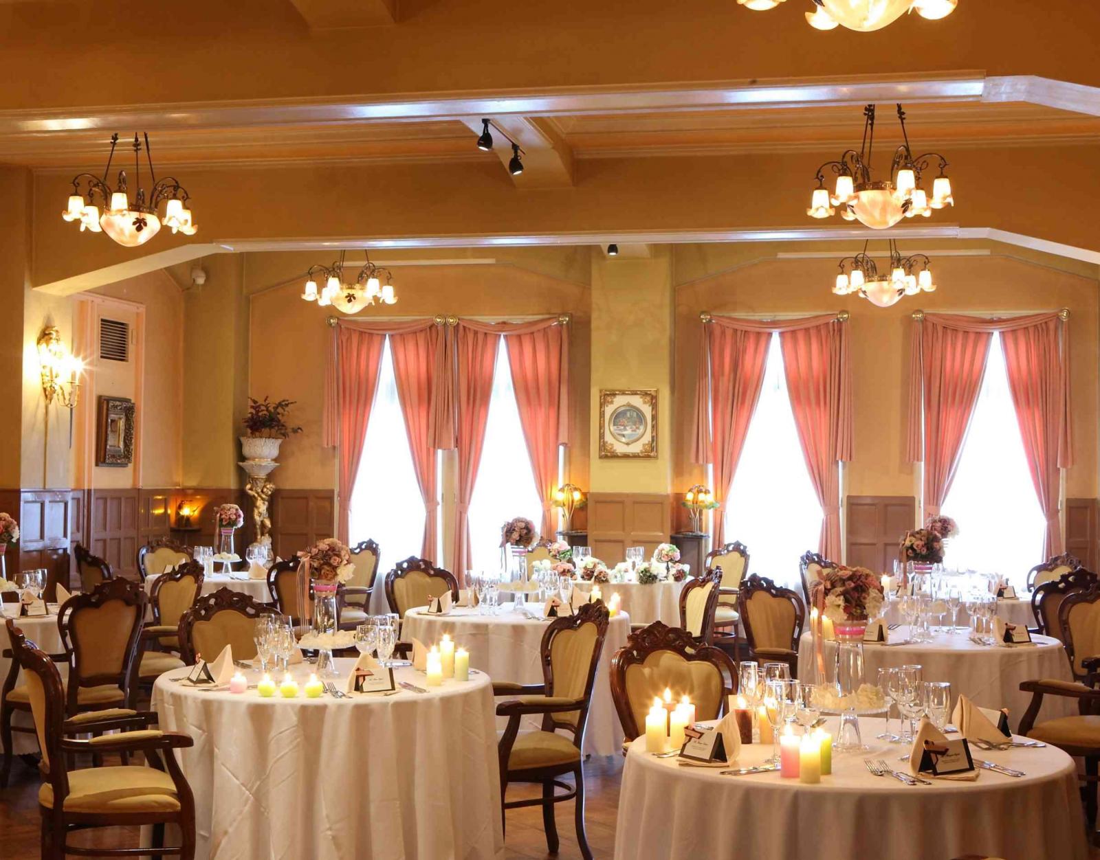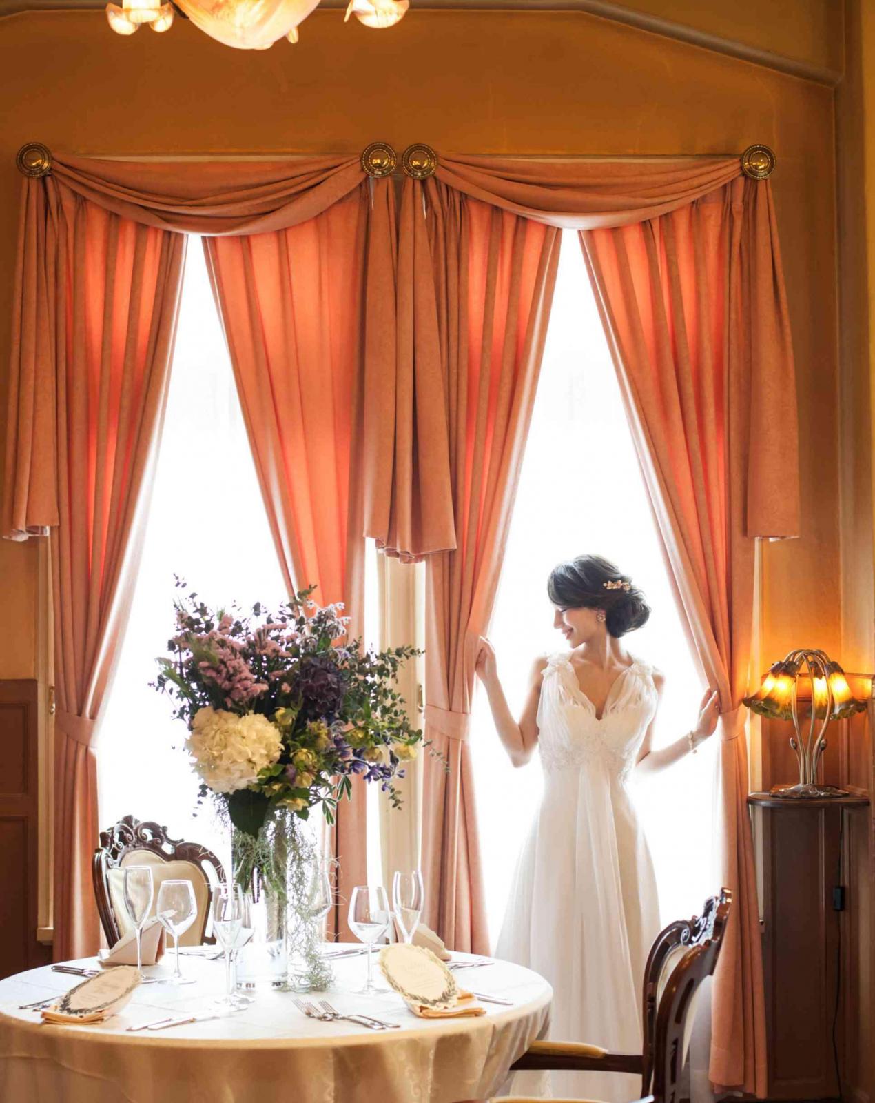 華美過ぎない適度な装飾が配されたダイニングルーム。甘すぎない大人の贅沢感にあふれた時間をお過ごしいただけます。昼間にはたっぷりと差し込む自然光が、アンティーク家具と共におふたりを爽やかに照らし出します