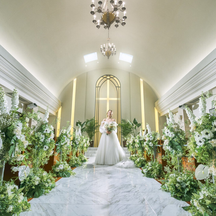白亜の独立型チャペルが挙式の舞台。館内は白と木目を基調とした内装と大理石のバージンロードが印象的な清楚な空間です。ドラマティックなプロジェクションマッピングや大階段でのフラワーシャワーなど多彩な演出が可能です。