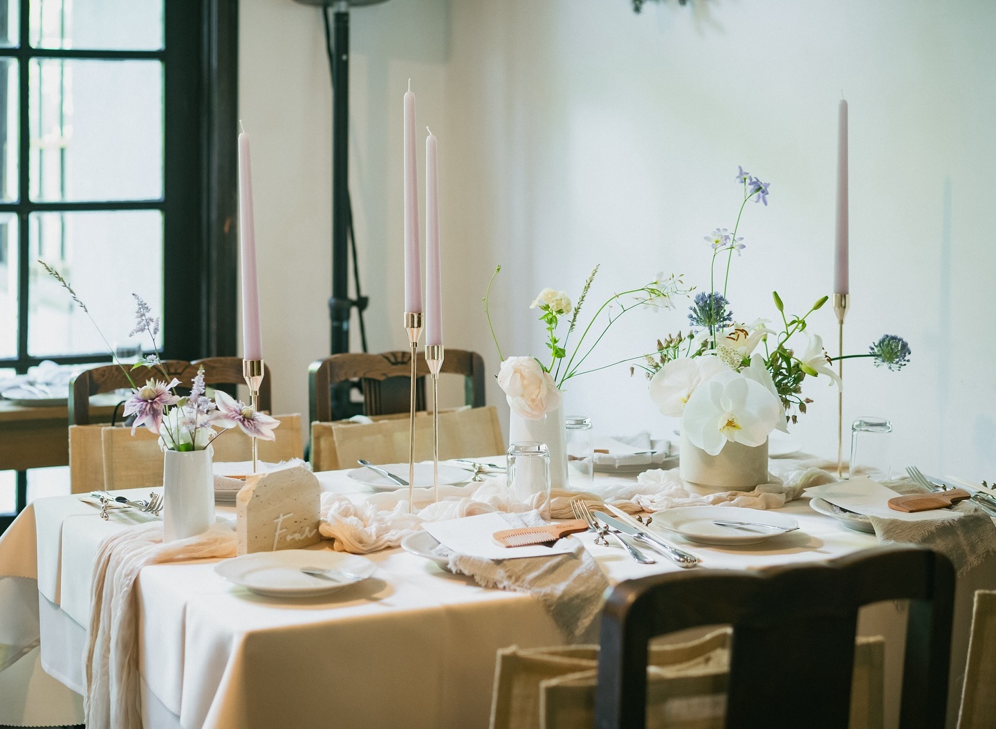 披露宴は場所を移動してデュボネさんへ🕊️ テーブル装花は白を基調として くすみブルー、ピンクを所々で可愛かったあ‼︎ 席札は、旦那が美容師で美容院がきっかけで 出会ったこともありネーム入りコームにしました🍃