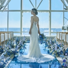 目の前に東京湾を望む、全面ガラス張りの開放的なチャペル。海へとまっすぐ伸びるクリスタルブルーのバージンロードが印象的です。海外リゾートのような絶景を眺めながら、心温まるセレモニーが叶います。