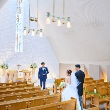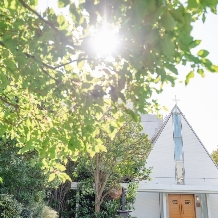緑の芝生が爽やかなガーデン内に佇む独立型チャペル。天井から注がれる温かな光が、愛を誓い合う新郎新婦を明るく包み込む、感動的な挙式を実現。ゲスト席とバージンロードの距離が近く、アットホームな少人数ウェディングを行えるのもポイントです。