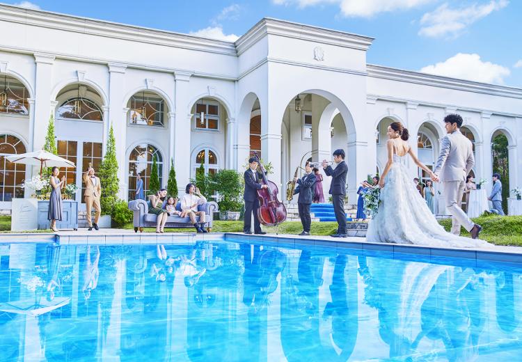 2000坪もの広大な敷地を有する式場を完全貸切。四季折々の自然に彩られた白亜の大邸宅に加え、光が差し込む独立型チャペルやプール付きガーデンを用意。素材選びから厳選した美食のもてなしと共に、ゲストとの語らいを存分に楽しめます。
