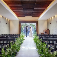 祭壇の奥に滝が流れるチャペルでは、ロマンティックなセレモニーが実現。水の音が爽やかな雰囲気を演出する空間で永遠の愛を誓ったあとは、ゲストから祝福のフラワーシャワーが舞い降ります。