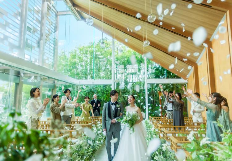 自然のぬくもりを感じる木目調の独立型チャペル。一面がガラス張りで陽光がたっぷり差し込み、祭壇奥には豊かな緑が広がります。チャペルの周囲には水が流れ、清らかで開放感あふれる雰囲気に包まれています。