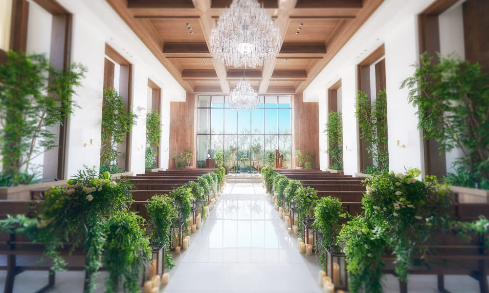正面の大きな窓からはたくさんの自然光が降り注ぎ、少人数ウエディングにふさわしい温かな挙式が叶います。