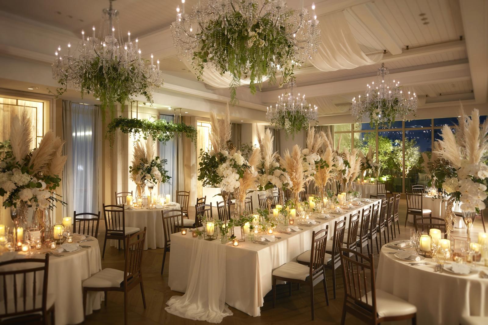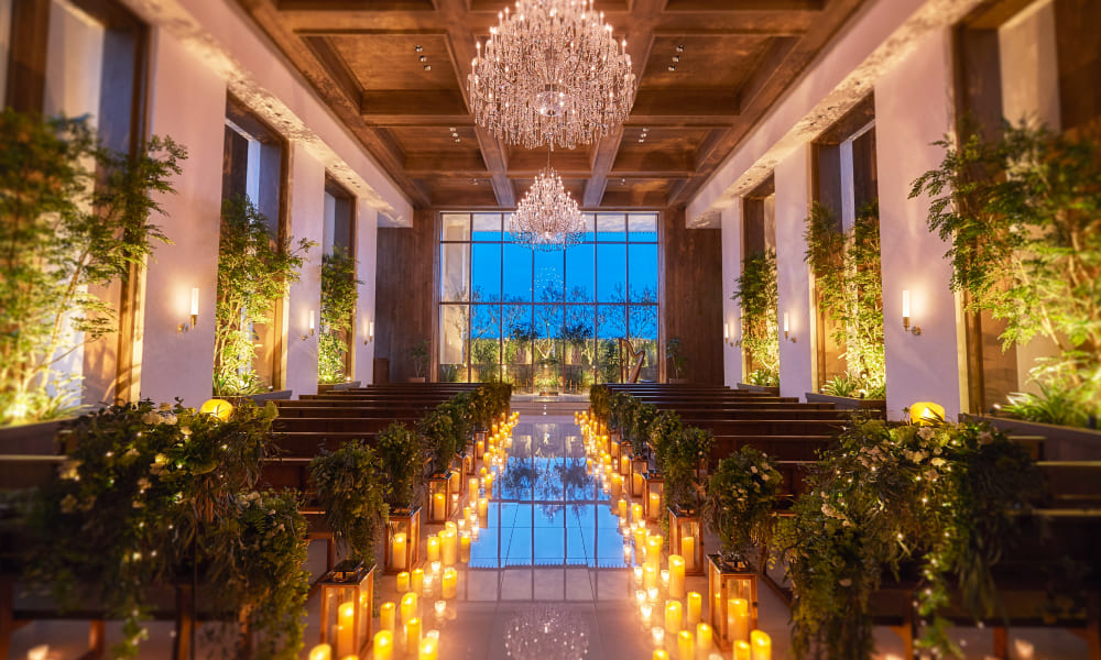 ナイトウェディングは大人花嫁から人気の演出。ホワイエもキャンドルやライティング演出で飾り付けて。