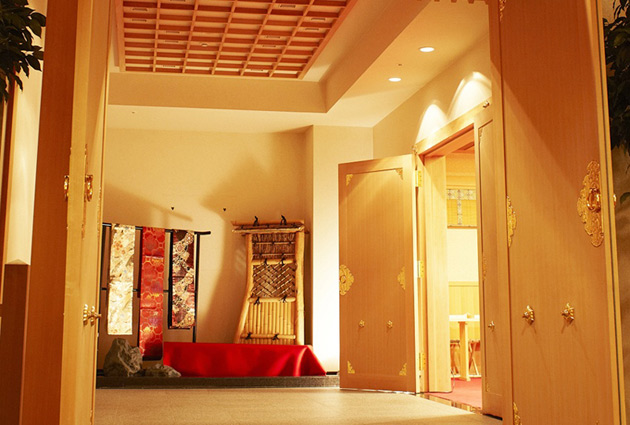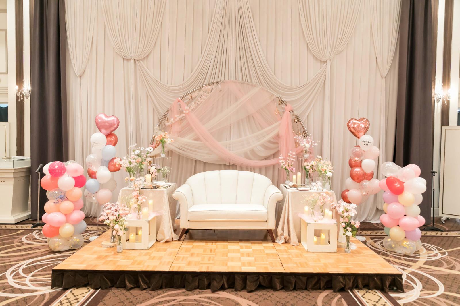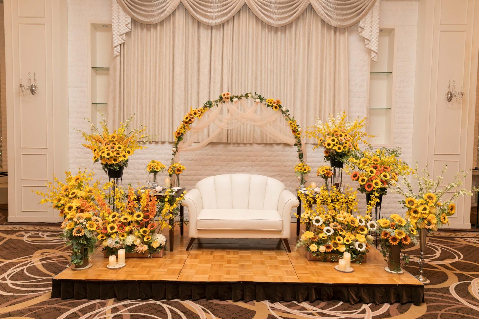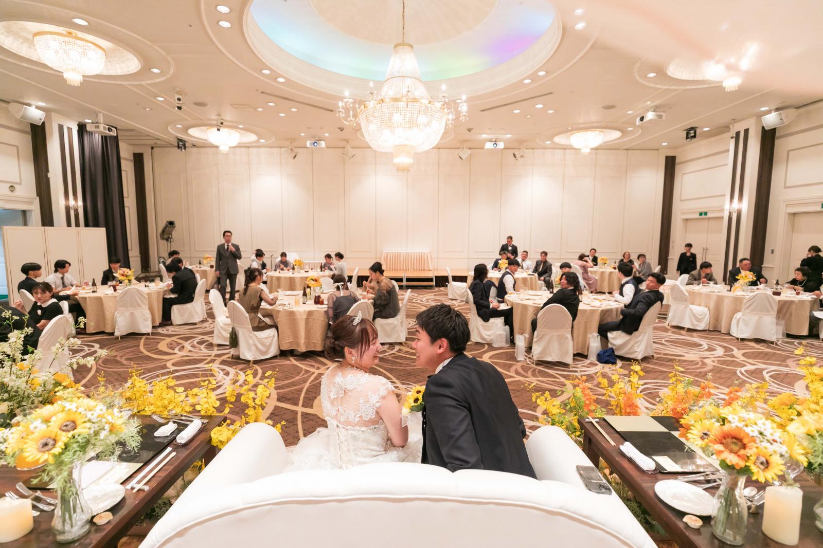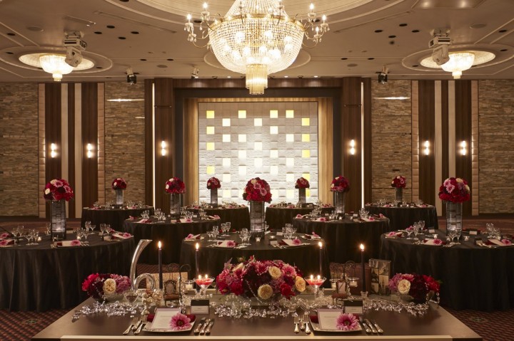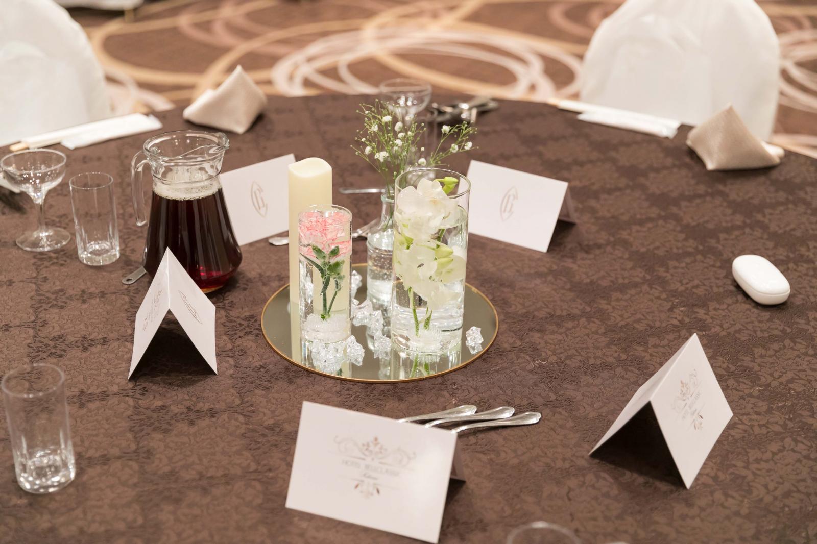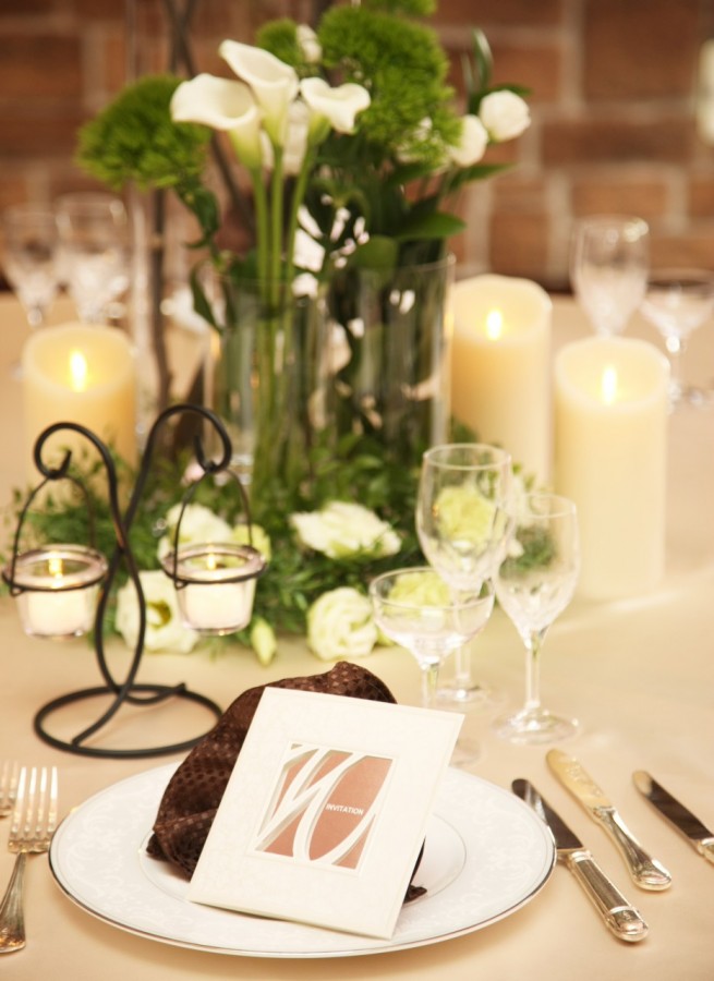 音、光、映像で感動的に。シックなブラウンを基調としたダイヤモンドホールは、シックだけれど温かみのあるメイン会場。モダンで落ち着いたコーディネートにピッタリ。