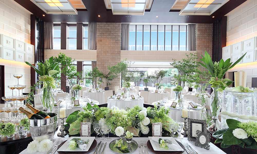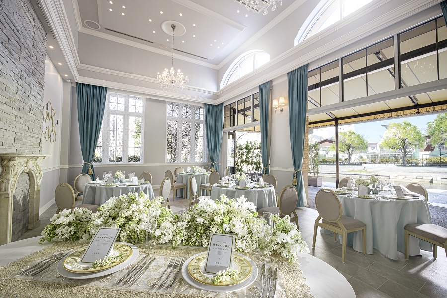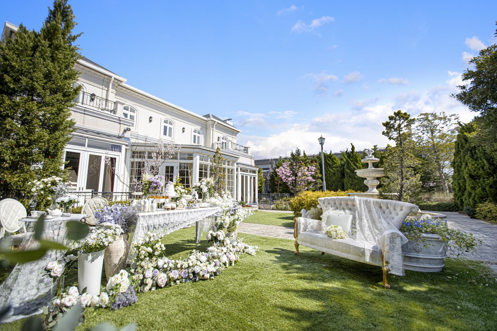 吹き抜けの天井にはシャンデリアがきらめき、窓の向こうに広がる緑溢れるガーデンがくつろぎの時間を生み出します。緑あふれるガーデンでパーティや写真撮影を。