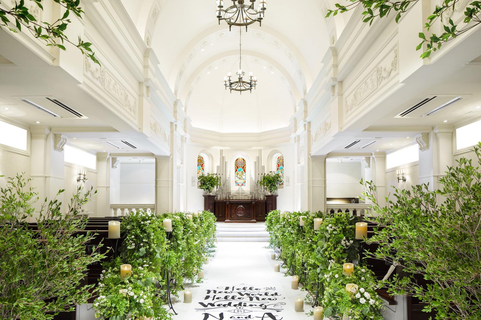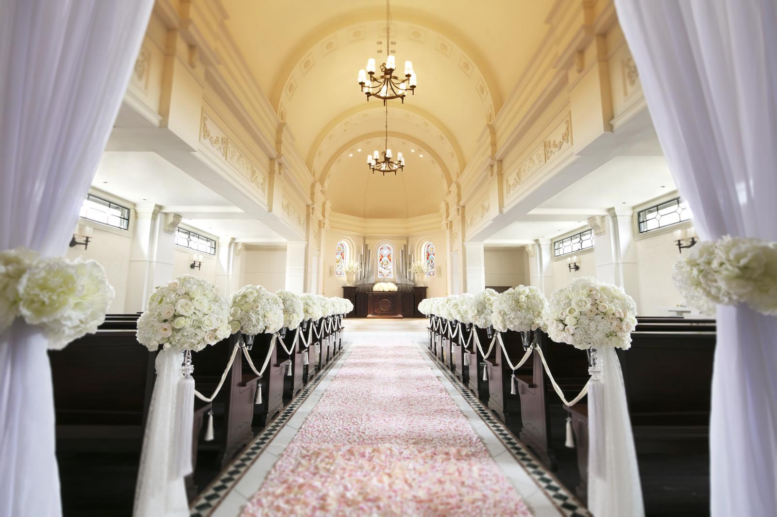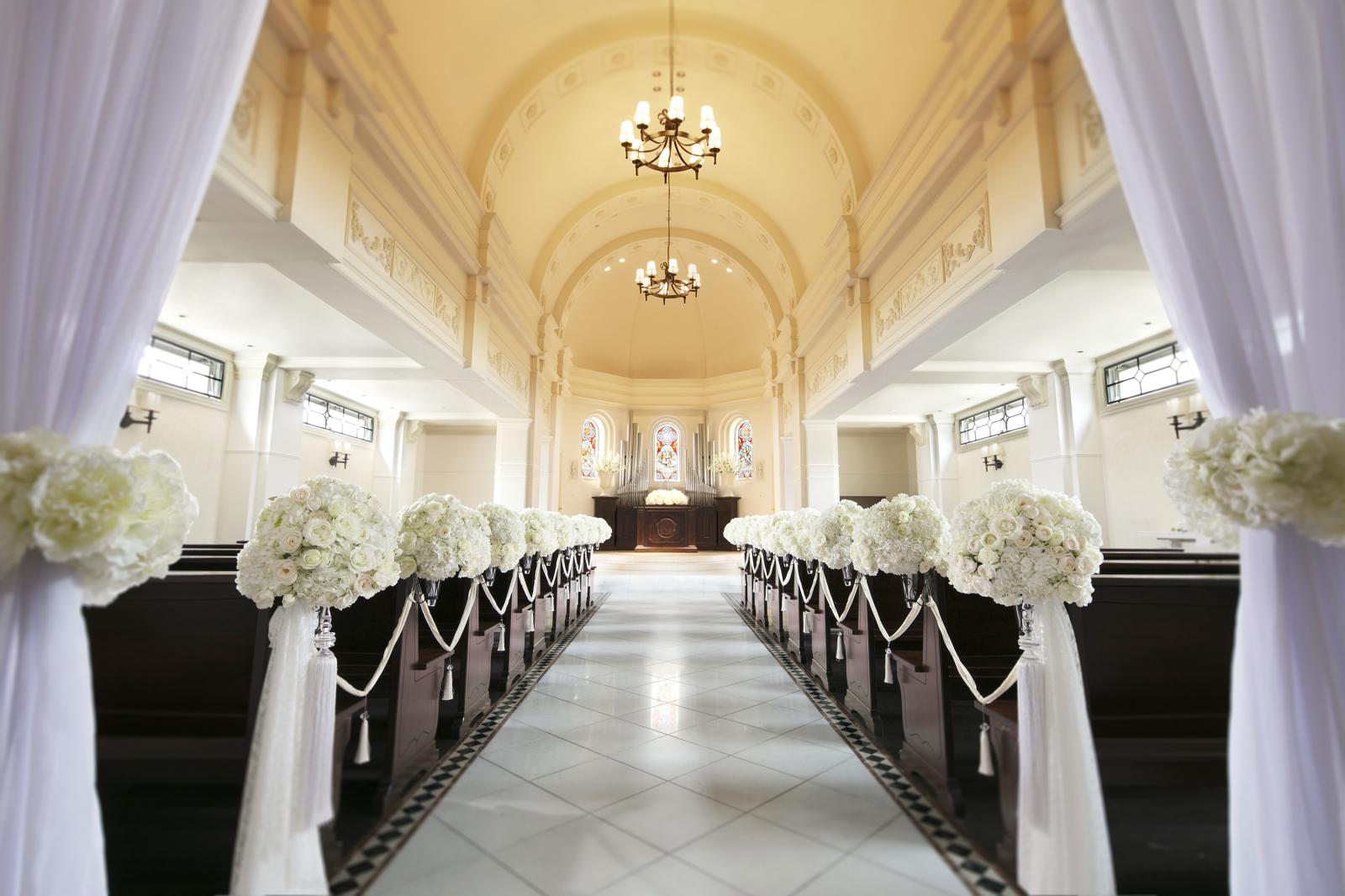 天井高7mというスケール感が魅力の大聖堂。厳かな誓いの後は大階段で、映画のワンシーンのようなアフターセレモニーを。