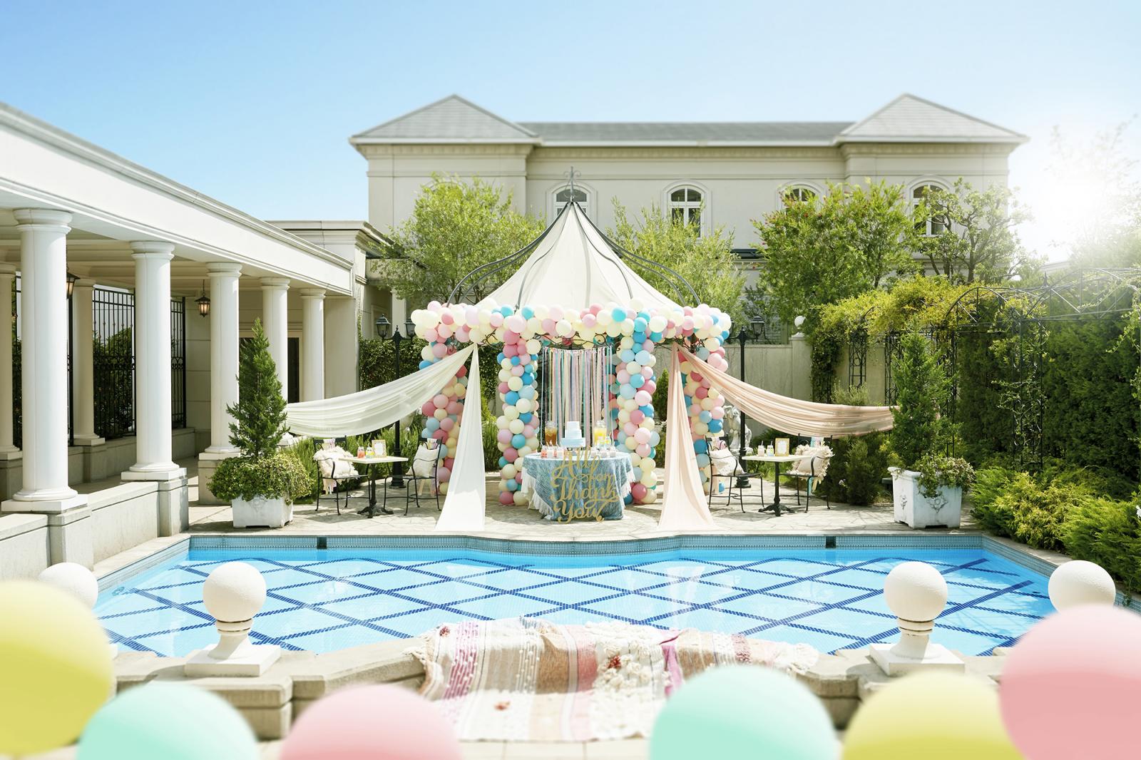 海外の上質なリゾートを思わせる邸宅すべてがおふたりのための空間。2階層吹き抜けの開放的なダイニングでの会食の後は、プール付きのガーデンでくつろぎのひとときを。