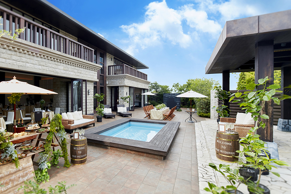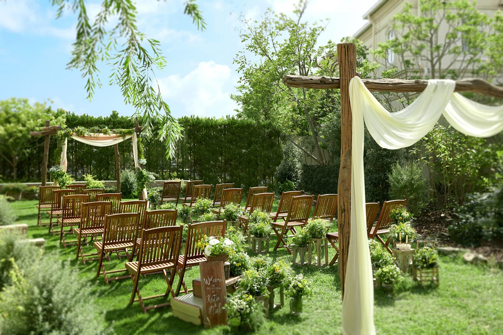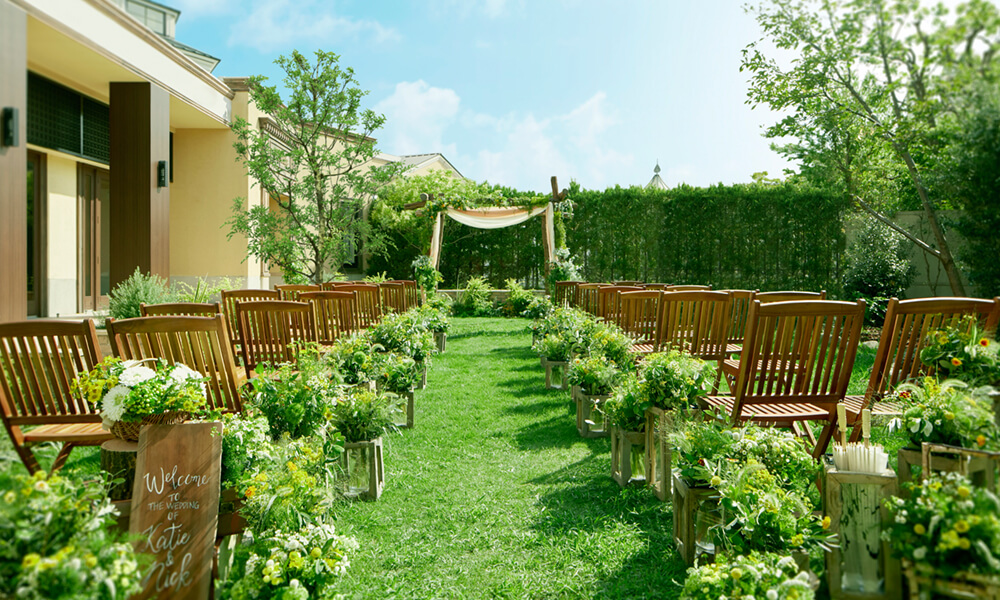 青空と緑に囲まれたガーデンチャペル。陽ざしやそよ風が心地よい開放感抜群の空間で、あたたかな陽ざしと濃緑が純白のドレス姿がより一層美しく引き立つガーデンで感動的なセレモニーを。