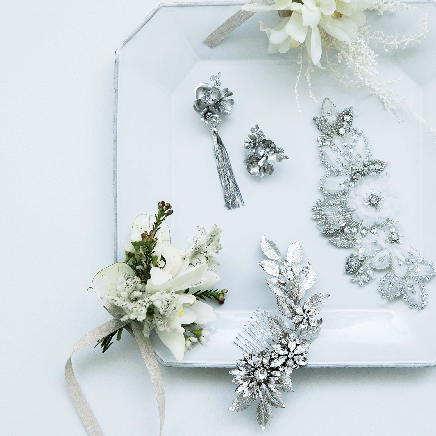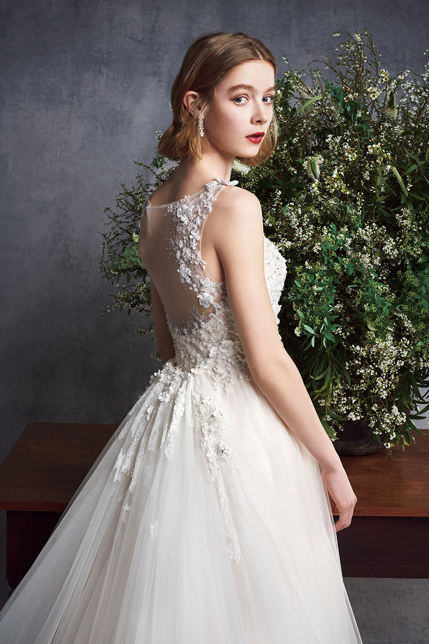 ひとつひとつ丁寧に縫い付けられたクリスタルビーズやスパンコール、とろけるような光沢が魅力のシルク、計算されつくしたフラワーモチーフなどその素材のすべてを厳選し、デザイナーが一点一点丁寧に手作業で制作。