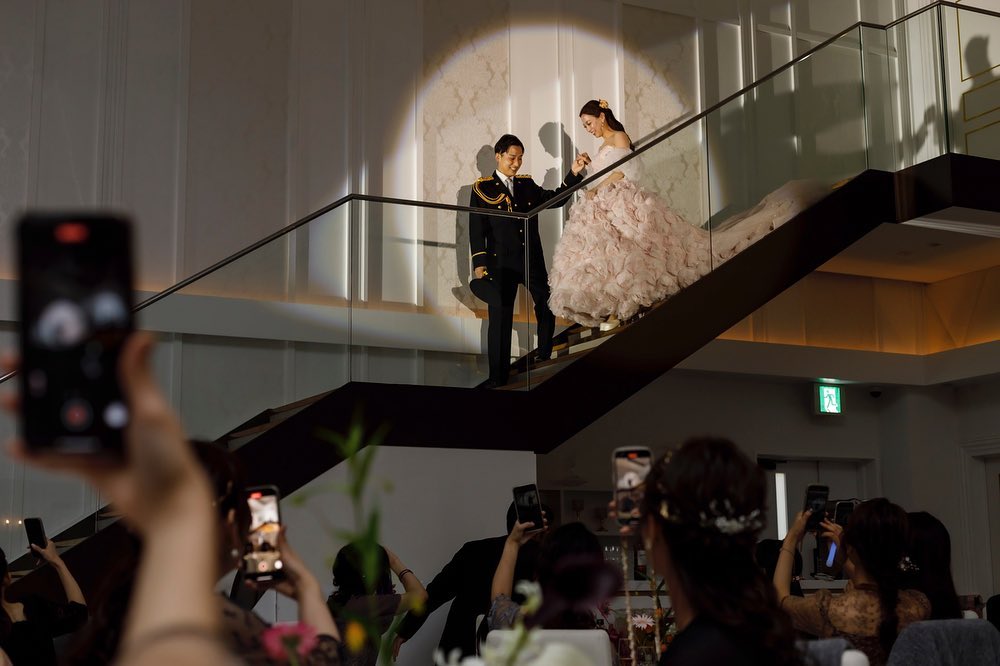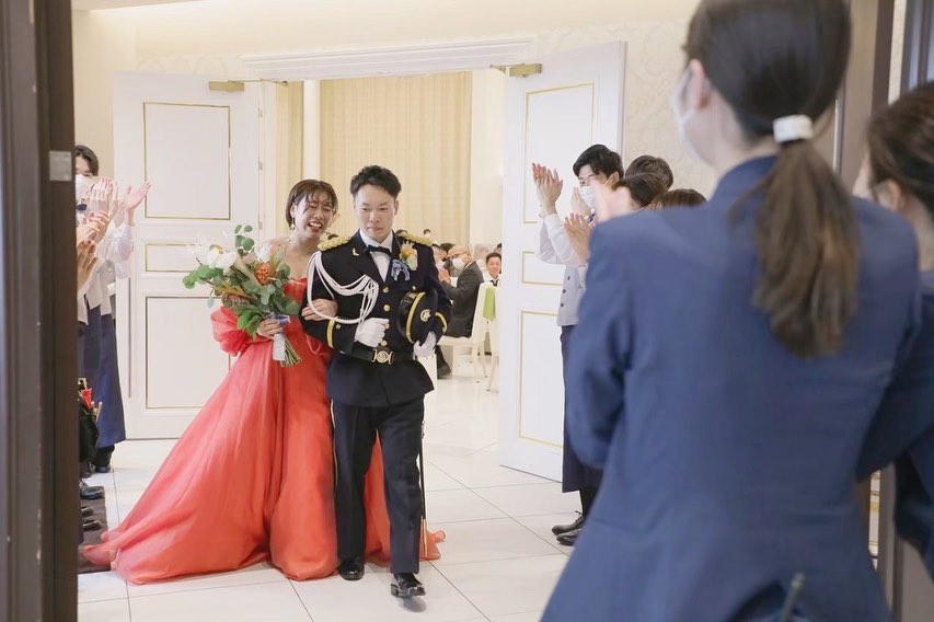 お色直し入場は階段からしました☺️💕 旦那の職業柄、敬礼のポーズ笑 旦那も制服かっこいいし、私のドレスは淡いピンクでお花と刺繍とリボンという、私の好みドンピシャで即決したぐらいお気に入り😆✨ みんなが私と言えばピンクって分かりきってると思って、ドレス当てクイズはしませんでした🤣🤣