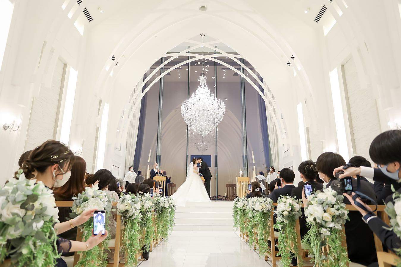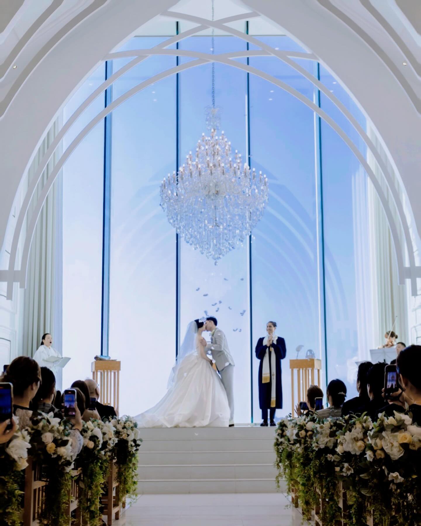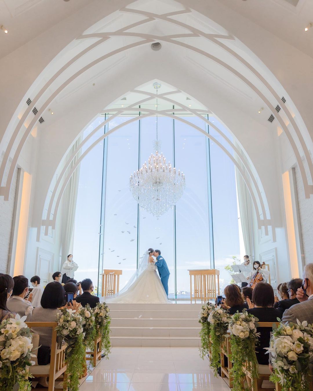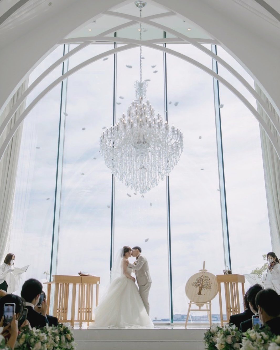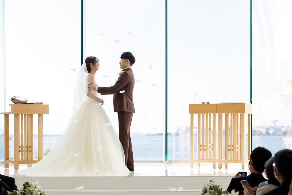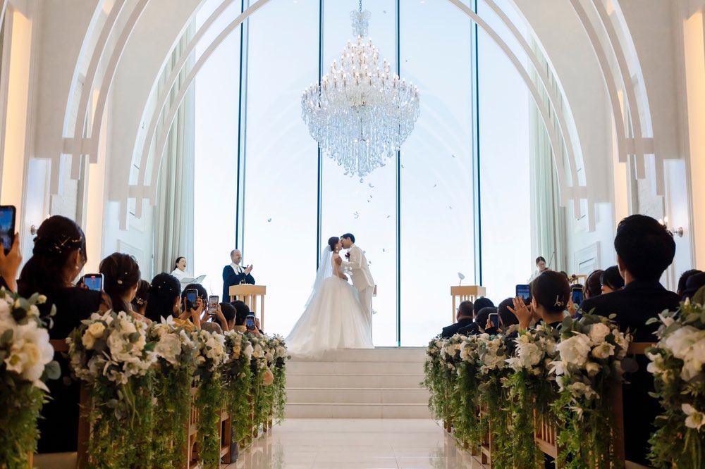 【10:23】 誓いのキス ララシャンスはチャペルの広い天井から 天使の羽根を降らせることができます 旦那さんとは振ってきたタイミングで ちゅーだね!って構えていましたが 顔近すぎて落ちてるのも分からずで← 8秒くらいキスしてた思います(笑) 動画で見返すと、 ふわっと宙を舞いながら落ちてくる様子は 天空におるみたいに素敵でしたね♡