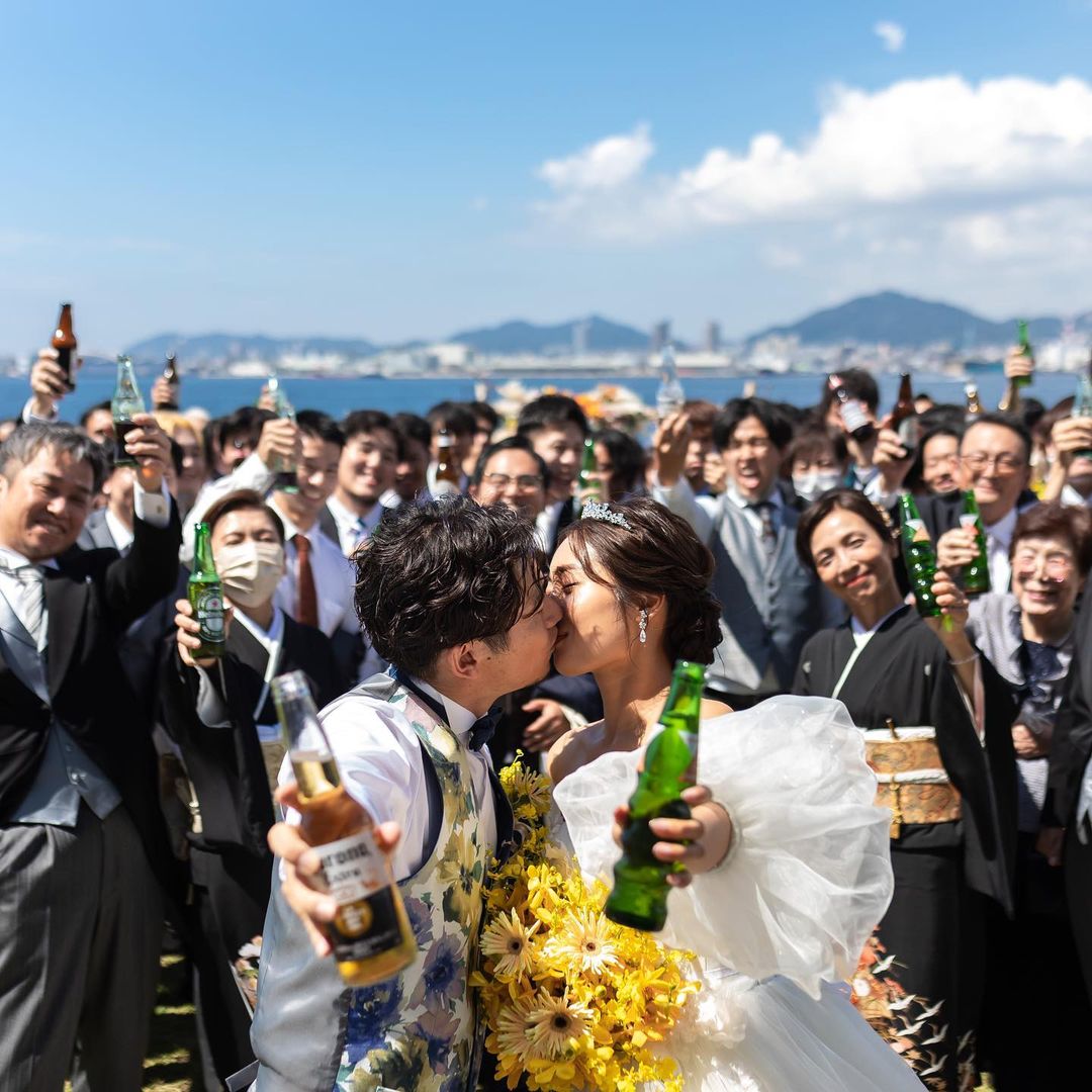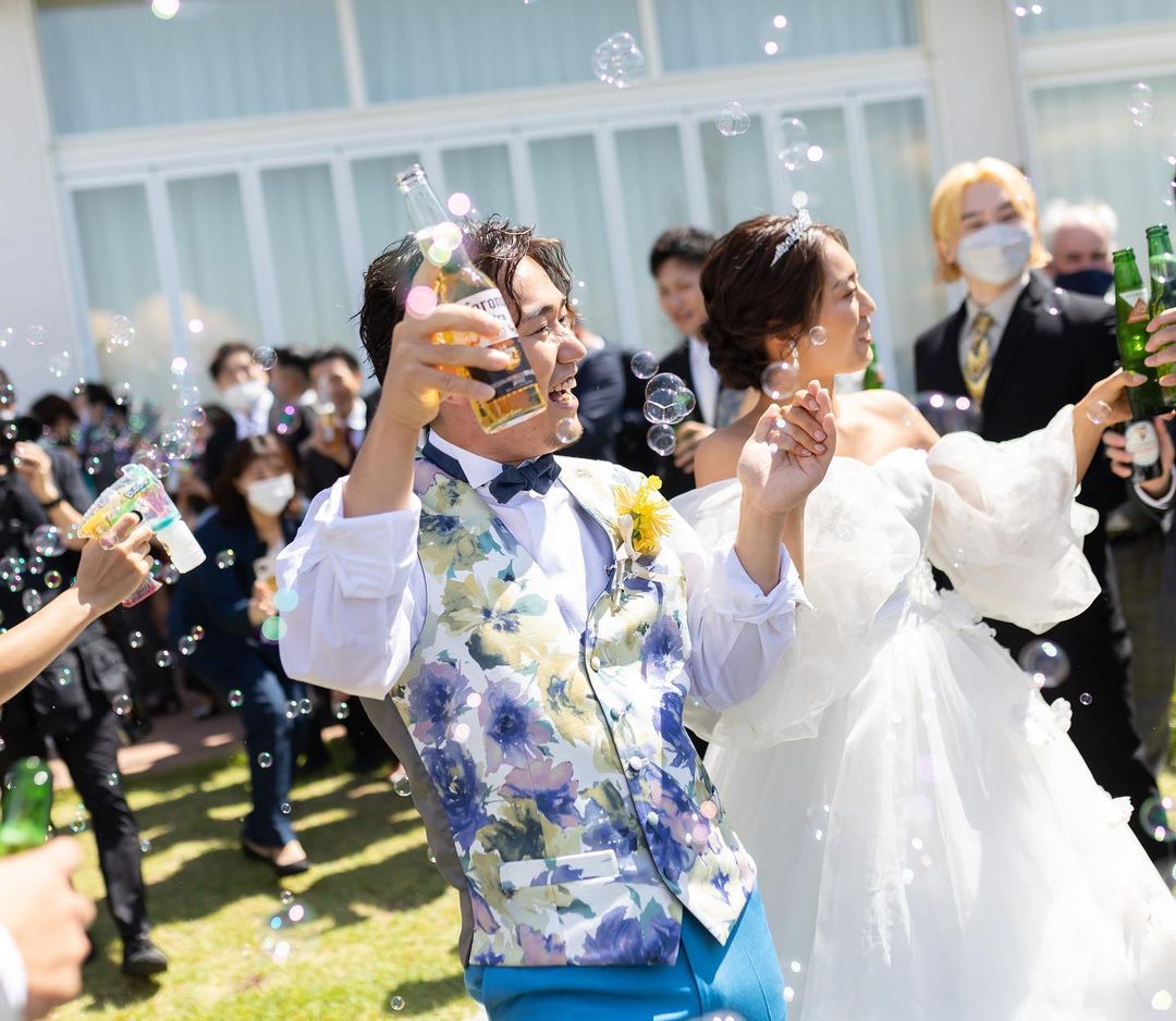 【𝙶𝚊𝚛𝚍𝚎𝚗】 ガーデンでの演出も盛りだくさんなのです✨ 〜流れ〜 ・バブルシャワーで入場 ・乾杯挨拶 ・世界のビールで乾杯 ・集合写真 ・ダミーケーキ登場(こける) ・本物のケーキ登場 ・ケーキ入刀 ・ファーストバイト ・ドローンバイト ・一旦退場 →ヘアチェンジへ