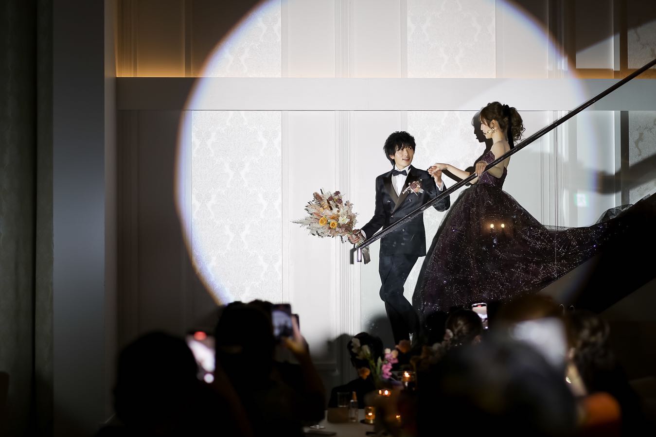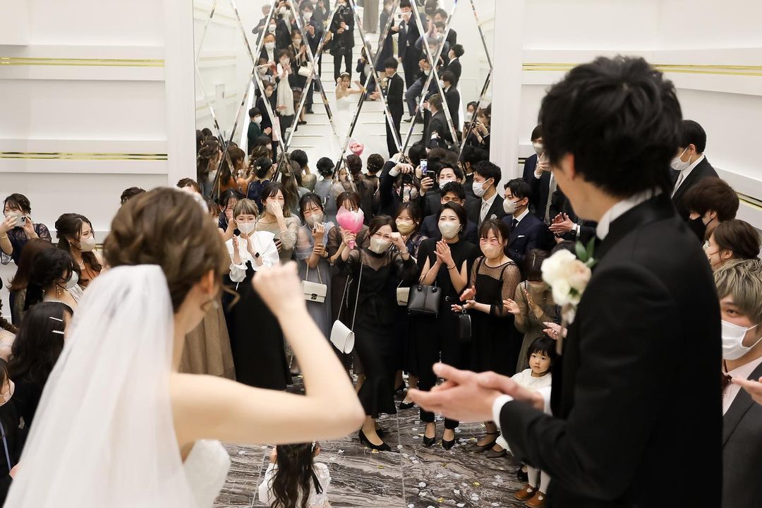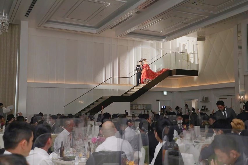 🏷新郎新婦入場 いよいよ披露宴入場〜🌟 階段から入場しました。 最初はでかいバズーカみたいなシャボン玉マシンを持って サングラスかけてド派手に登場したい! (挙式とのギャップを作りたい!)と思ってたけど バズーカは見つからずサングラスはやっぱり恥ずかしくない? みたいになってどんどん縮小し… スリーコインズで買えるバブルスティックを持って登場 (遠すぎて誰にも見えなかったし写真にも写ってない) でも扉が開いた瞬間みんながこっち見て笑ってくれてて、 あ〜はじまった!たのしみ!って思った! 1枚目は妹を見つけて2人で笑ってるところ🥰 BGMはサンボマスターの世界はそれを愛と呼ぶんだぜ🎸 最初からブチ上げたいな〜て考えてて、 オットから提案されて天才かと思った。