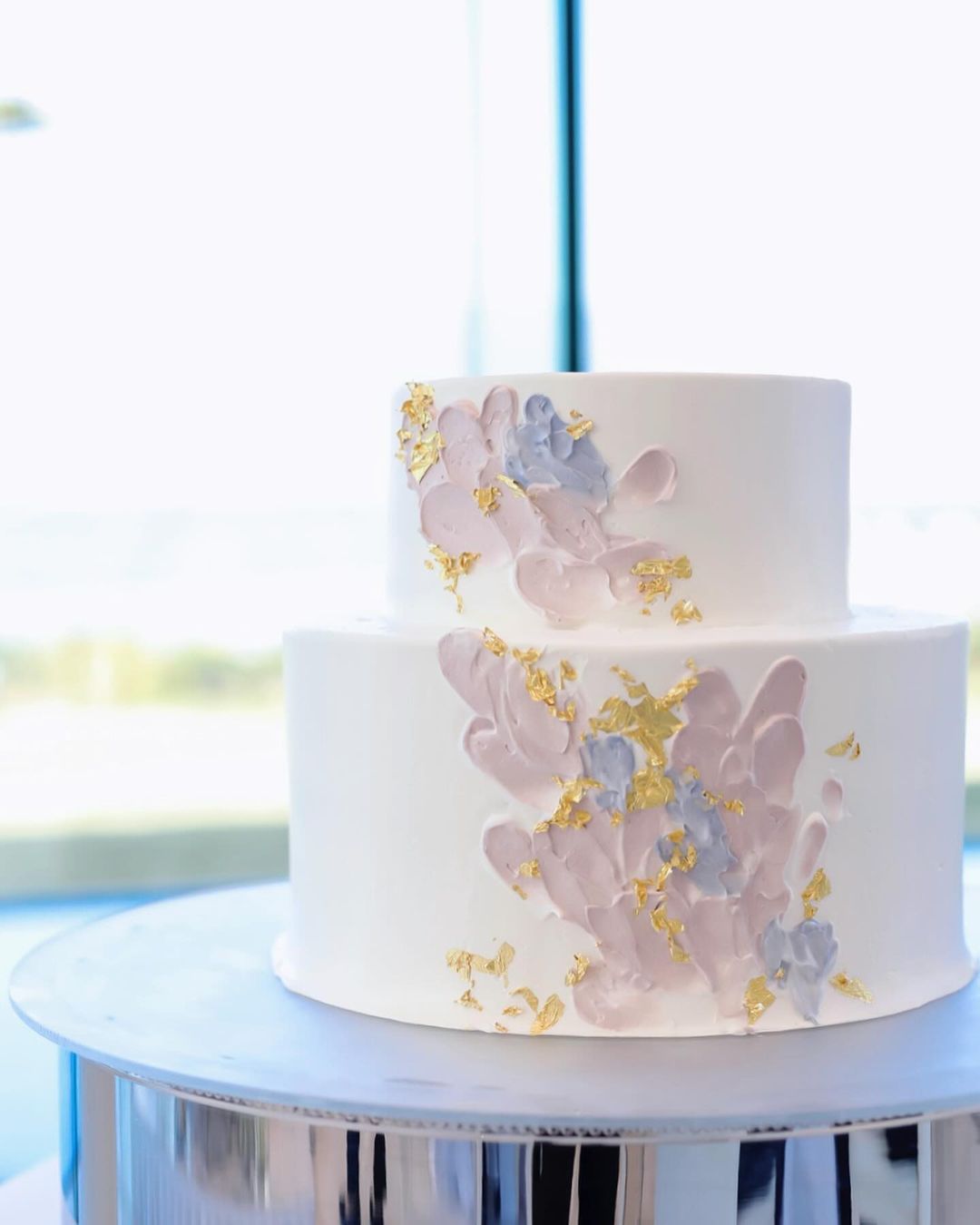 ウェディングケーキ 白のシンプルベースに ペイントしたようなデザインをお願いしました🍰 色合いもパステルピンクと アクセントに柔らかいブルーを入れて 金箔で少し華やかにしてます