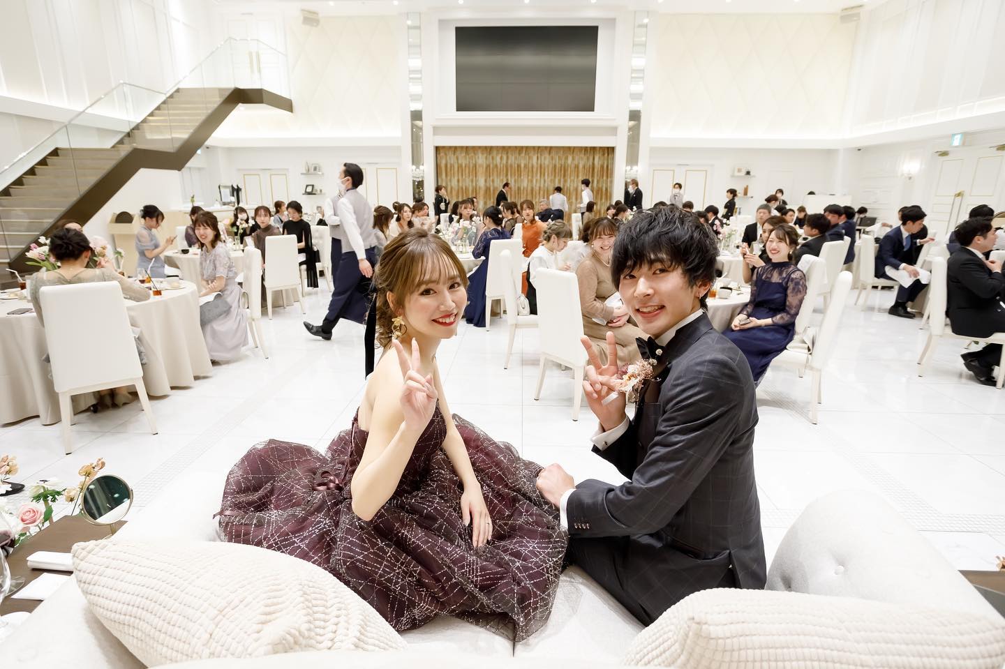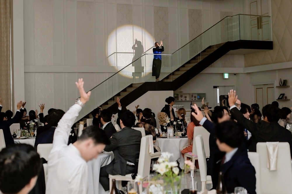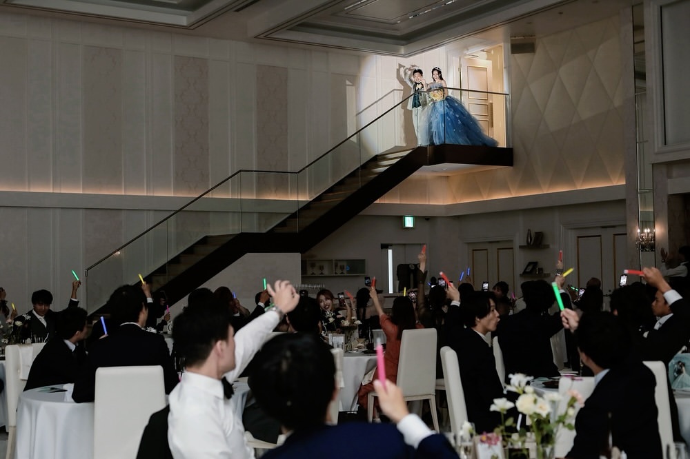 披露宴𓂃 いよいよ披露宴の 開幕𓆸 階段から降りる時 ほんとに緊張してたけど みんなが笑っている姿を みてとっても 嬉しい気持ちに なりました𓏲 もっとお客さんの方を みて手を振ったり すればよかったね〜と 2人で反省𓂅 (こけないように必死でした笑) 色当てのうまい棒を 振ってくれていて みんなのリアクションが とってもおもしろかった なあ𓇠
