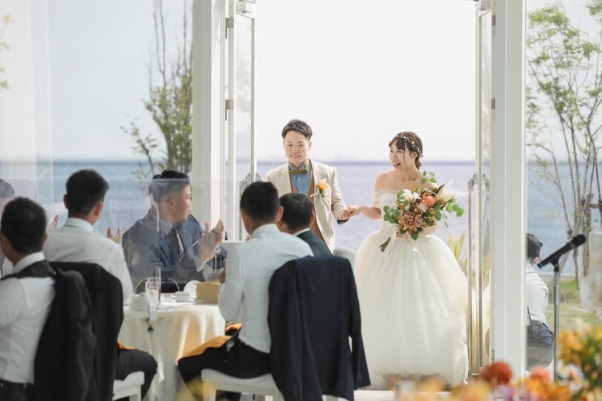 🏷お色直し入場 お色直しはガーデンから入場〜 みんな予想以上にヘアカットに驚いてくれて、 一生分の黄色い声援を浴びご満悦でした びっくり顔が写真にしっかり残ってるの 天才でしかない… そういえばオットもタキシード着替えてもらって! 茶色は本人が乗り気じゃなかったけど、 このドレスには茶色しかないので押し切った!🤎 bgmはbrunomarsのmarry you 定番曲も入れたかった