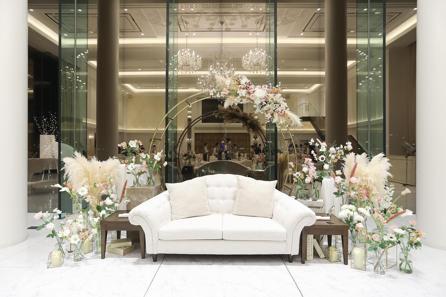 高砂🕊️ ソファーの後ろ部分がお気に入り 大好きなピンクとパンパスグラスを たくさん使ってもらったメイン席🤍 ボリュームある感じにしてもらいました! 高砂は当日しかみれないので どんな感じになるかな〜って 思ってたけどイメージを全て叶えてくれてて お気に入りのメイン席になりました🤍