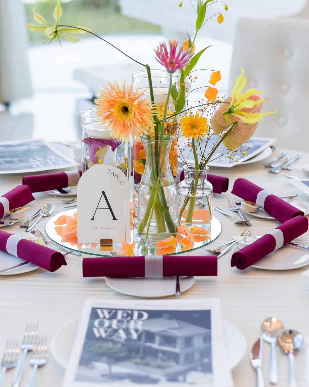 🏷オードブル ゲストが着席した時点で ウェルカムオードブルが用意されてるスタイル🍽 ほぼ一目惚れで決めたテーブルクロスの色も オードブルのソース?も💮俯瞰の写真かわいいな〜!