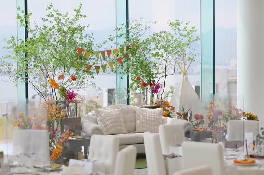 披露宴会場𓂃 𝑐𝑎𝑚𝑝 オレンジ グリーン をテーマに装飾して いただきました🧡💚 明るくてナチュラルで お気に入りの高砂 です 𓇠 テントも置いてるよ👌🏻 ̖́-