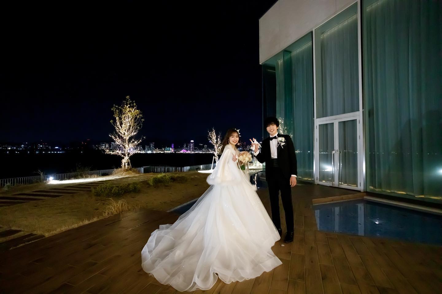 披露宴入場🕊️ 私たちはガーデン入場にしました! 天気にも恵まれ夜景も綺麗で最高でした◎ 挙式と違い披露宴入場前はリラックスしすぎてたな🥺笑