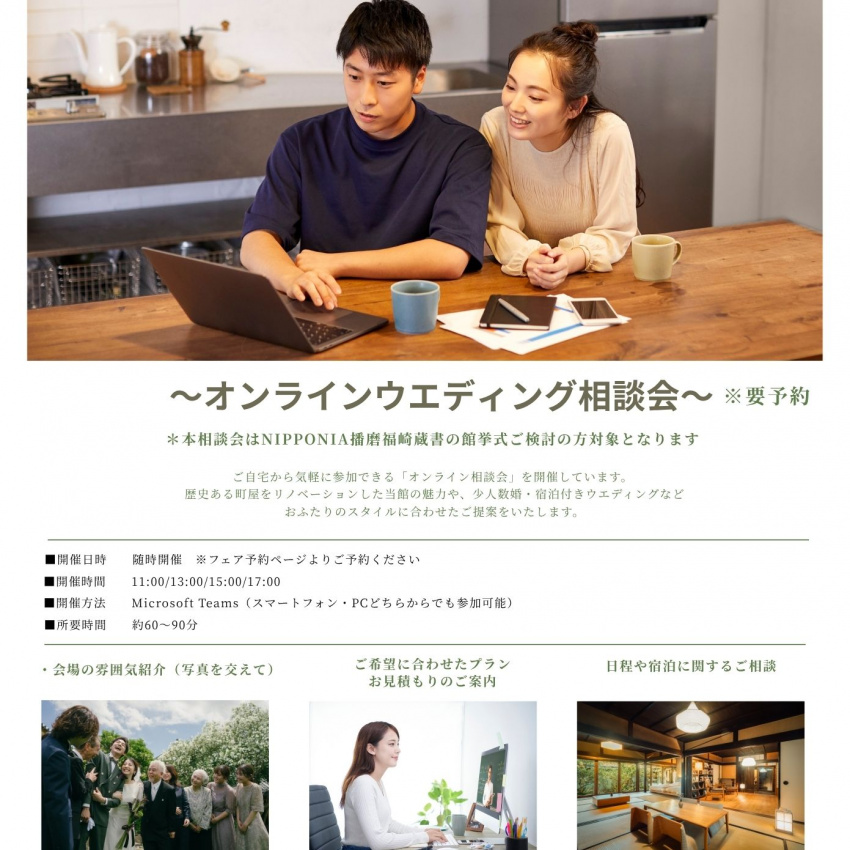 ご自宅から気軽にご参加いただける「オンライン相談会」を開催歴史ある町屋をリノベーションした当館の魅力や、少人数婚・宿泊付きウエディングなど、おふたりのスタイルに合わせたご提案をいたします。Microsoft Teamsを使用して、会場の雰囲気紹介写真を交えてご希望に合わせたプランやお見積もりのご案内、宿泊や日程に関するご相談お気軽にご参加ください。