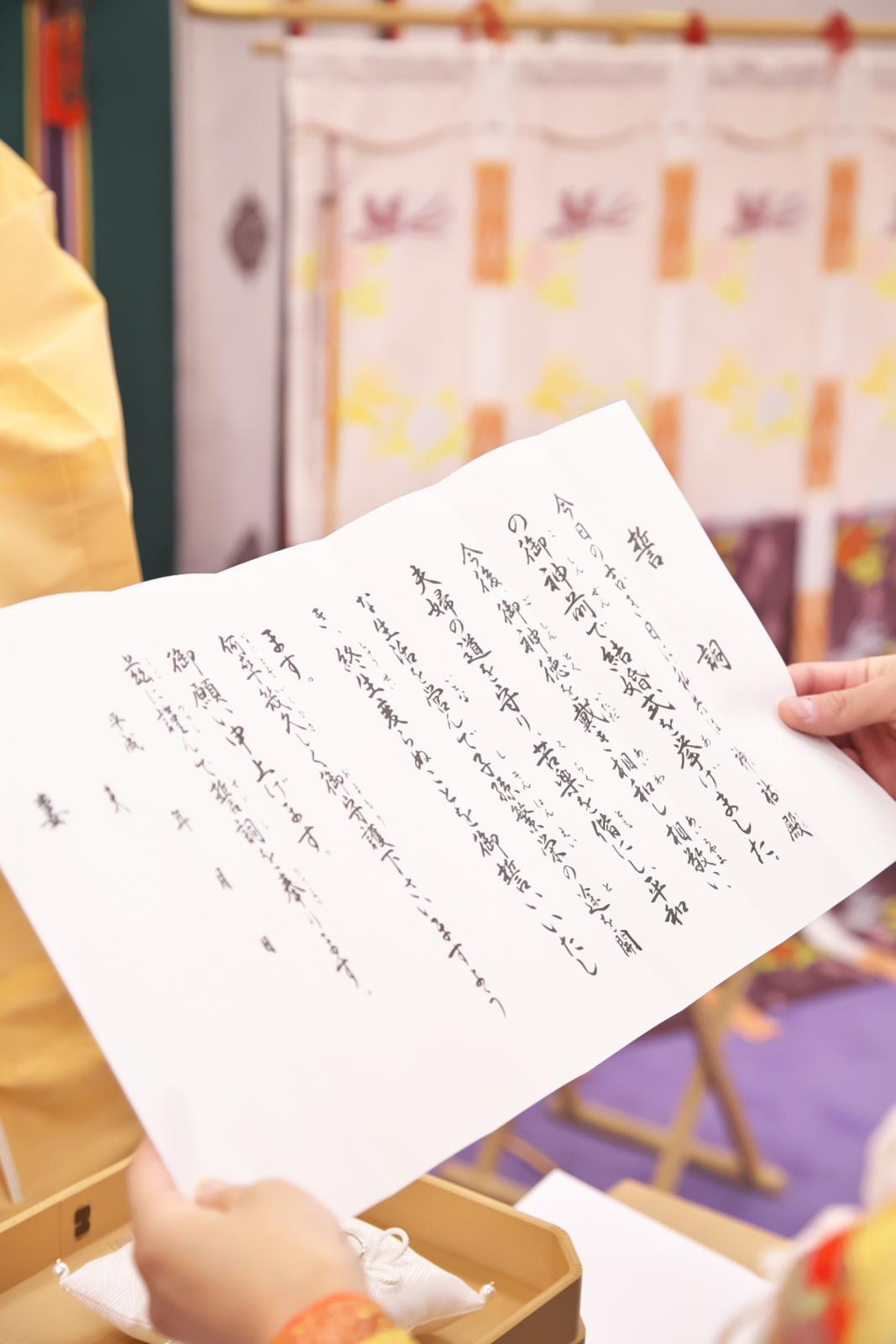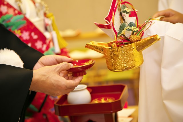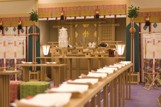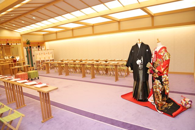 柴山神社の宮司と巫女が執り行う、神前式。