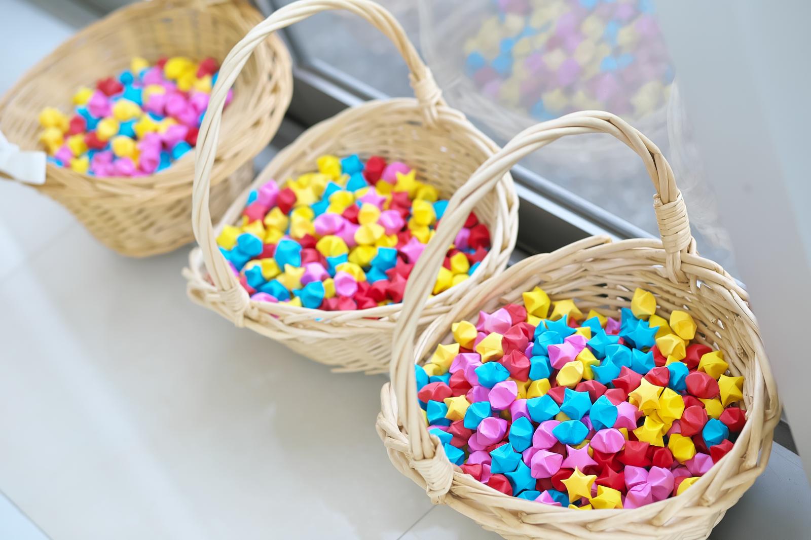 手作りのスターや折鶴シャワー、ファーストミート