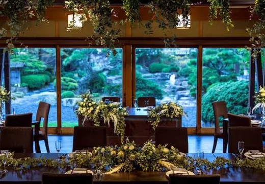 披露宴会場は、日本の伝統的な建築様式である書院造をリノベーションしたスタイリッシュな空間。大きな窓からは、広大な日本庭園を望むことができます。落ち着いた雰囲気の中、格式高い大人なパーティーが叶うでしょう。