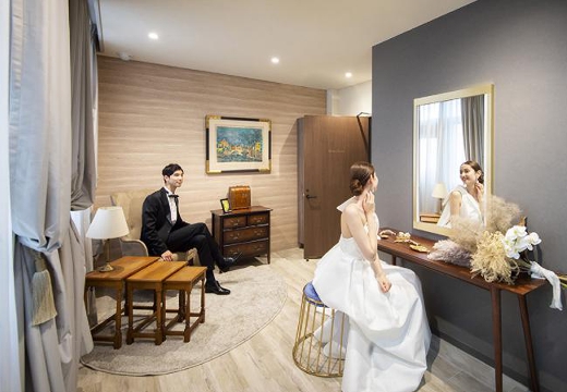 ハイセンスな衣装もバリエーション豊富に取り揃え。専属のスタイリストが衣装はもちろん、小物やヘアメイクまでコーディネートしてくれるので安心です。親族用控室やブライズルームなど、付帯設備も充実しています。