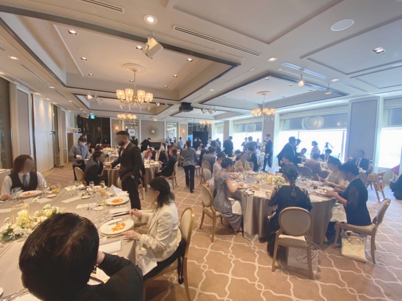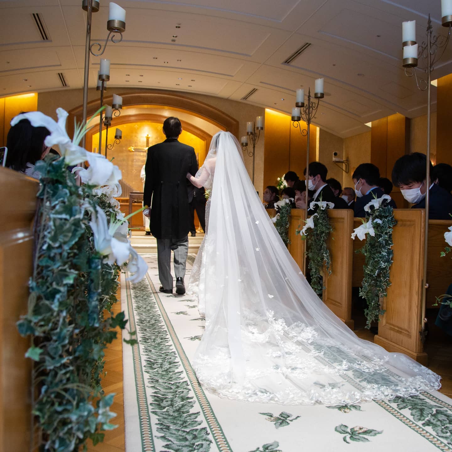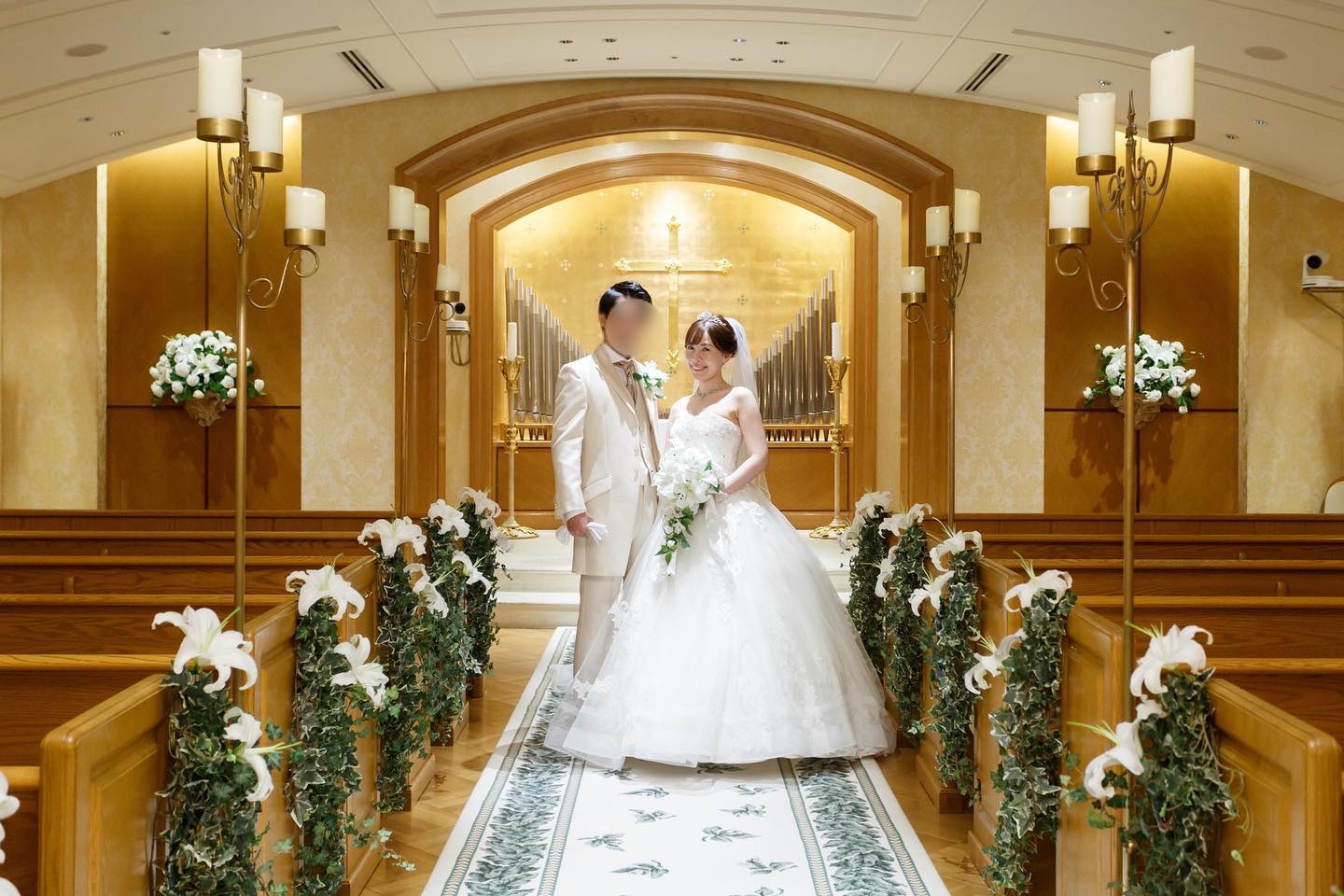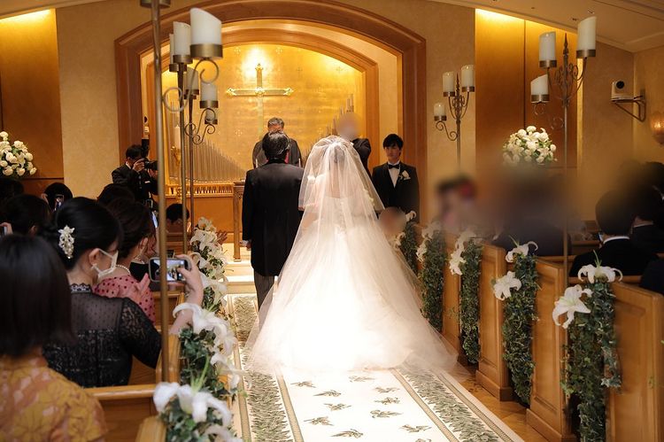 私たちの最終的な招待人数は92名となりました。 クラッシックチャペルは90名が着席できますが、コロナの感染対策として隣の方と間隔を空けていただくと74名までを推奨されています。 私たちは披露宴から招待するゲストが12名ほどおりましたので、80名が着席しています ぼかしちゃってますが、全列使用されつつも、全員余裕持って着席できたみたいで安心してます😮💨💕