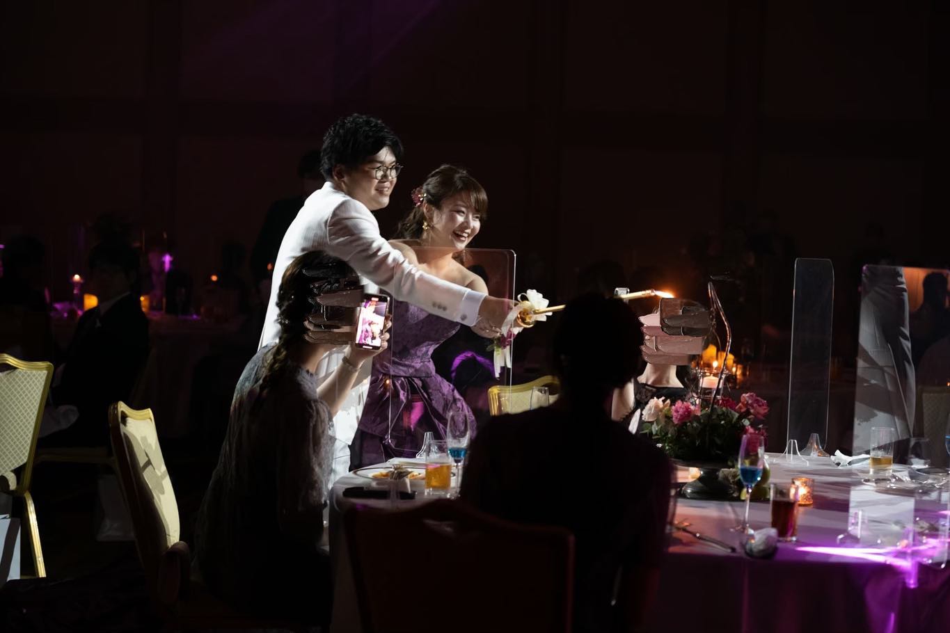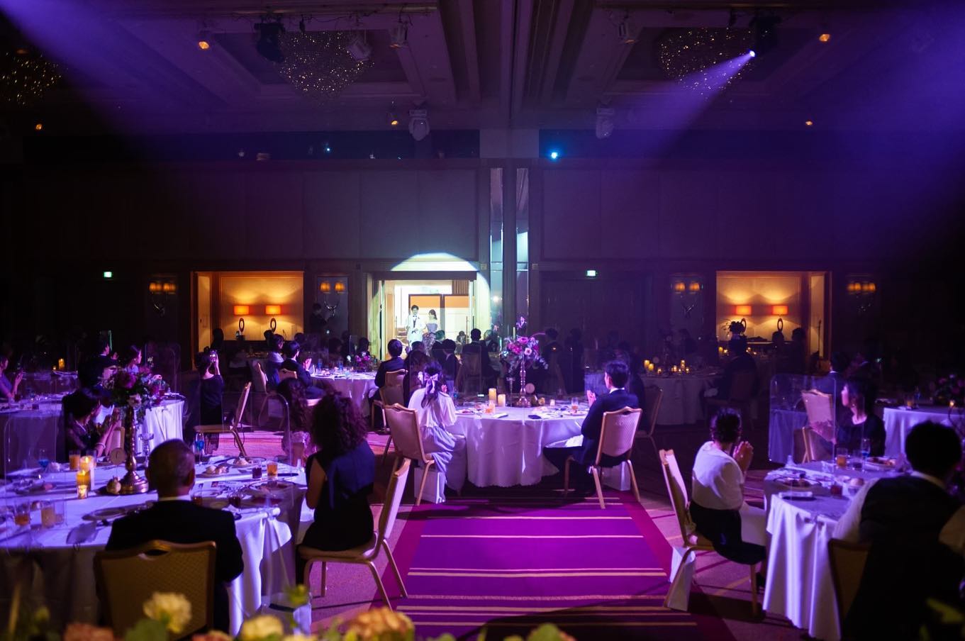 𓂃お色直し入場𓂃 🎶Miracles Happen / Myra プロフィールムービー上映後 司会者の方からお色直しドレスの色当てクイズに ついても再度案内して頂きましたので 入場する時には皆んなキャンディを振りながら 待っていてくれてました🍭 入場する時には会場の照明の色がパッとパープルになったのでドレスの色と合わせておりとても感動しました💜 アイテムフェアの際に見せて頂いたイルミネーションに 二人で感動してしまいまして テクニコさんに鳳翔限定の 「ランドマークイルミネーションLite」をお願いしました🌃限定って言葉に弱いな~😇笑 またアイテムフェアの特典でスモークを無料でつけて頂きさらに華やかさが増して綺麗でした~😍 ランドマークイルミネーションおすすめです🤩