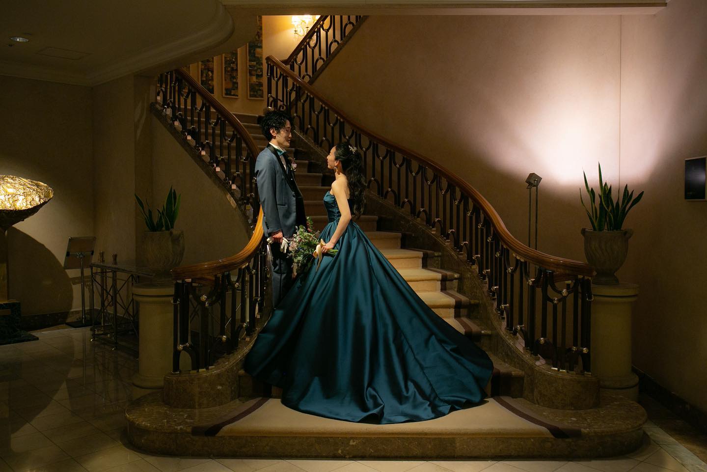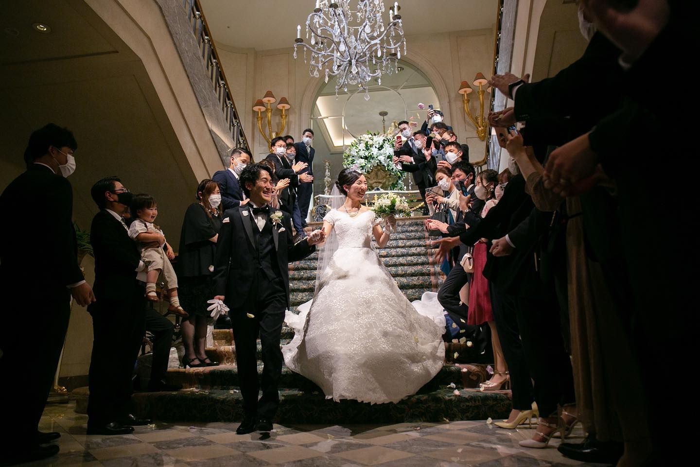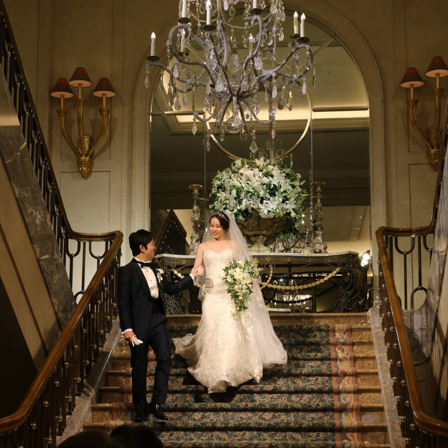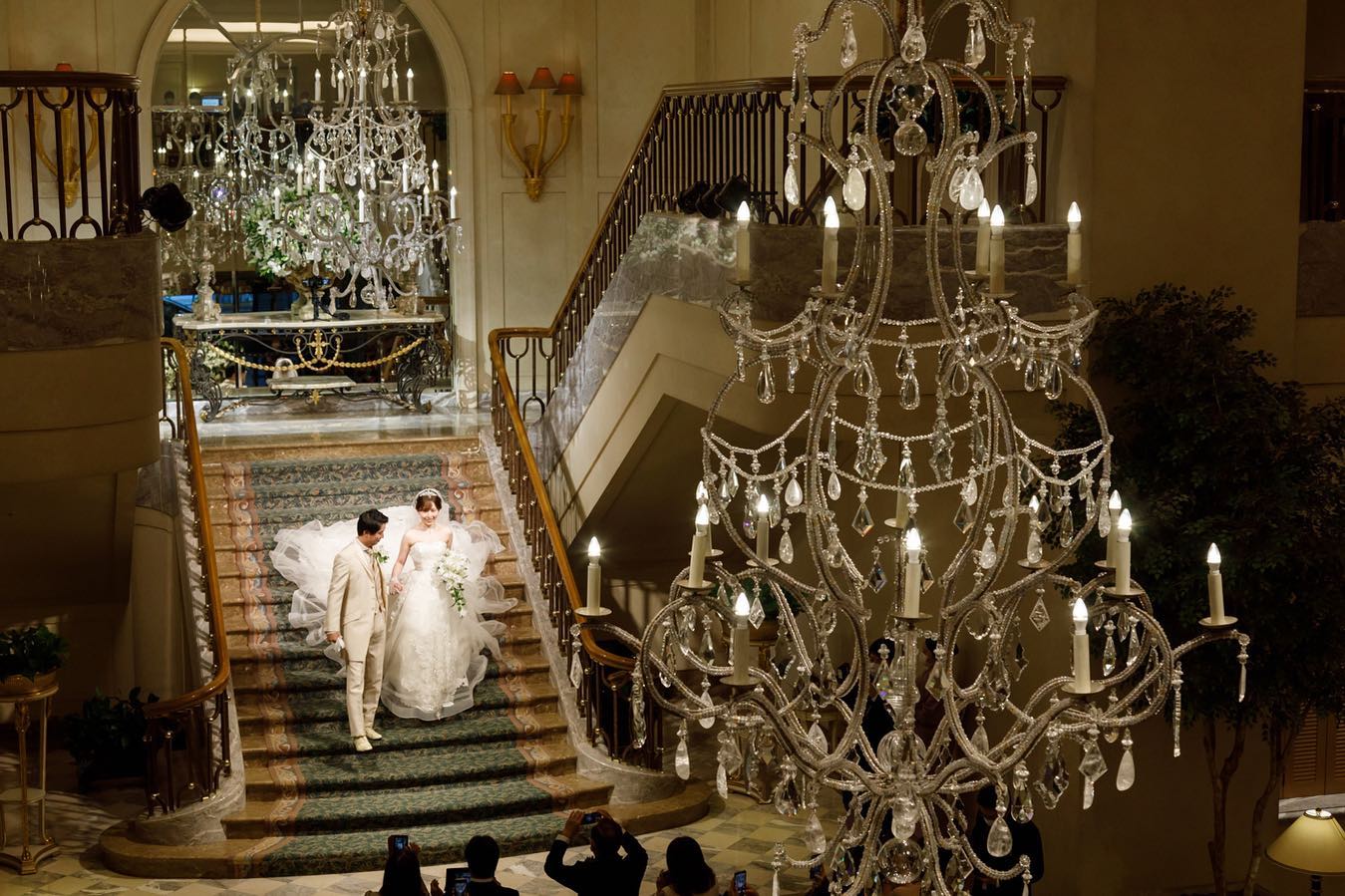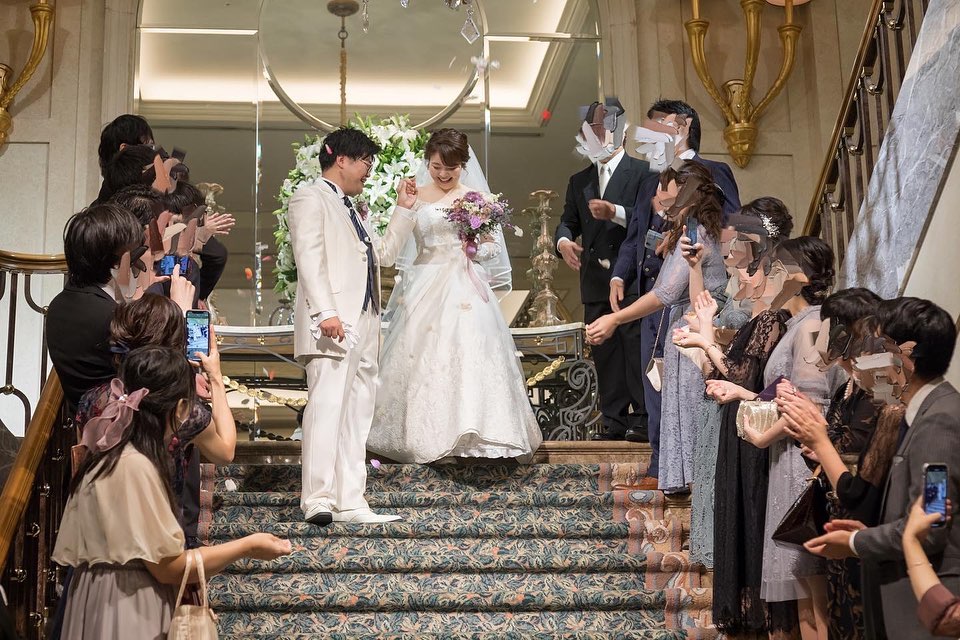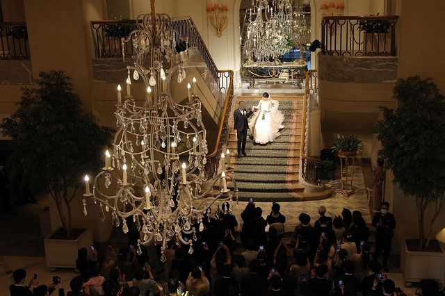 大階段 「絵画のように美しい写真を残せるように」と造られたこちらの大階段✨✨ ゲストみんなに見守られながら一歩一歩噛み締めて歩みました✨ 歩き方は介添さんが事前に教えてくださいましたが、私たちは前日に現地視察して練習させてもらっていたので不安なく降りることができました💕💕