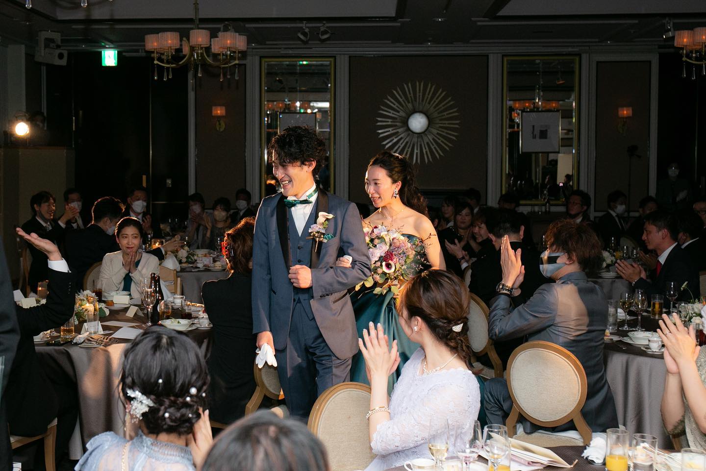 𓂃披露宴会場の風景𓂃 歓談中♡ わいわいしていてうれしいˎˊ˗ 感染対策のため、1テーブル7名までという制限でした。 68名呼んだので10テーブル! そしてわたしの親族が全部で8名だったので そこだけ大きなテーブルにしていただけました。 8テーブル以内なら会場を縦使いすることも可能だそうです。 十分広々としていました ˎˊ˗ 真ん中の方のテーブルとテーブルの間は 新郎新婦が横並びで歩けるほどの幅はなかったですが 腕組みではなく手でエスコートしてもらう形にして問題なしでした𓂃𓈒𓏸