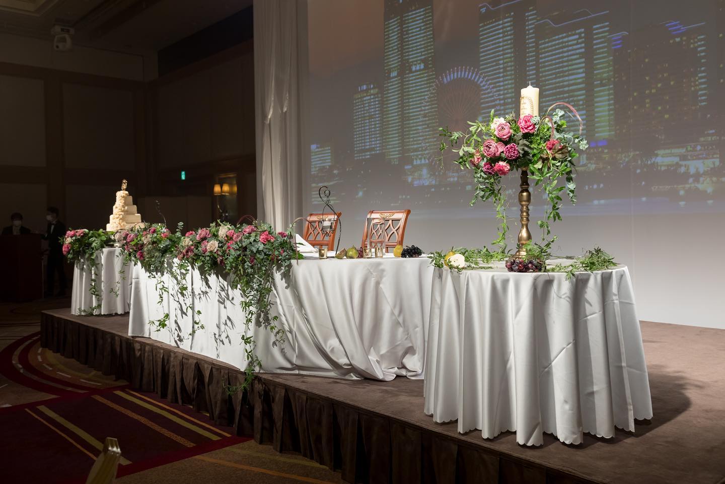 𓂃披露宴会場𓂃 挙式後 ゲストは披露宴会場に案内され 私たちは親族とスタジオにて写真撮影を行い 披露宴会場に向かいました✨ 披露宴会場は「鳳翔」です👑 華やかさを重視したいと思ってフェアに参加した際 鳳翔の天井の高さとスクリーンの大きさに ときめいてしまい「この会場以外考えられない…🥺」 と思い鳳翔の会場に決めました スクリーンの背景は他にも種類があり 私たちはみなとみらい夕焼けの風景にして頂きました 自分達の好みの写真を投影しておくことも可能です🌇
