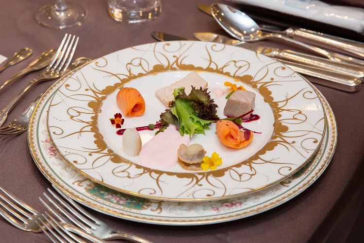 𓂃シェフのフランベサービス𓂃 メインのお肉料理をフランベしてもらいました。 私たちが選んだコースは1番スタンダードな¥13500のコースでしたが メインだけこの料理に変えたので 1人あたり¥16500でした! 大きな会場だと迫力にかけるかもしれませんが レインボー・オーロラなら問題なく迫力ありますˎˊ˗ ちなみにどの料理もゲストからは好評でした◎