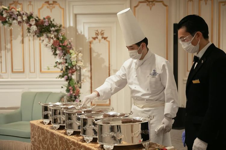私たちが祝電の確認などをしている間に、ゲストの皆さまが受付を済ませて会場へ❤︎ 通常ですと、決まった時間までは会場前のスペースでドリンクやオードブルを楽しみながら待つようなのですが、コロナの影響もあり初めから会場がオープンになっていて、席に座っていただくようになっていました。 会場前のスペースも広いので、広々とできてよかったかなと思っています☺️ 70階の会場では、一口オードブルがプラン内に付いてきます🌟 普段はウェルカムスペース横あたりの会場の入り口手前に置いてあり、自由に取っていただくスタイルですが、このご時世ということでホテルの方がテーブルを回って配ってくださいました😌