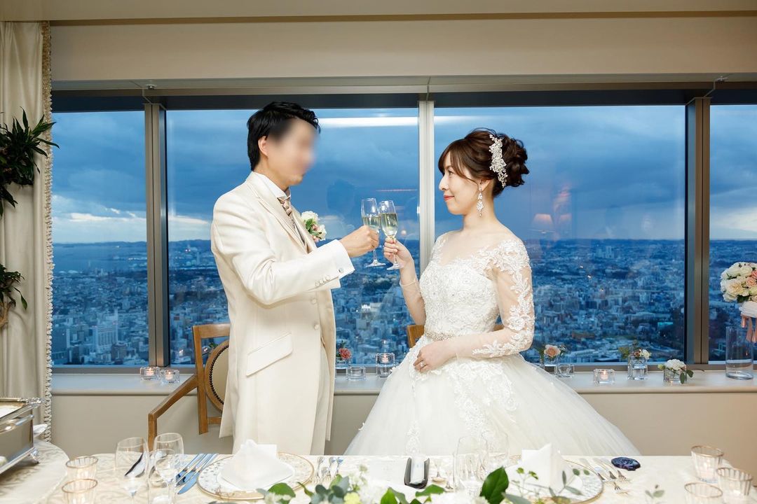 乾杯ショット🥂 お気に入りの一枚です(´∀`) 披露宴始まる頃には見ての通りの曇天☁️ この後大雨降ります😂 でもこの曇のお陰で白い衣装とのコントラストがはっきり出て逆に良い! 66階から見る景色はやっぱりロイパならでは👏 衣装については披露宴からボレロを着用、 ティアラを外してヘッドアクセに変更 ネックレス外してイヤリング変更 髪の毛は式の状態から少しルーズにしました(。・ω・。) 三枚目はゲストカメラです🌟