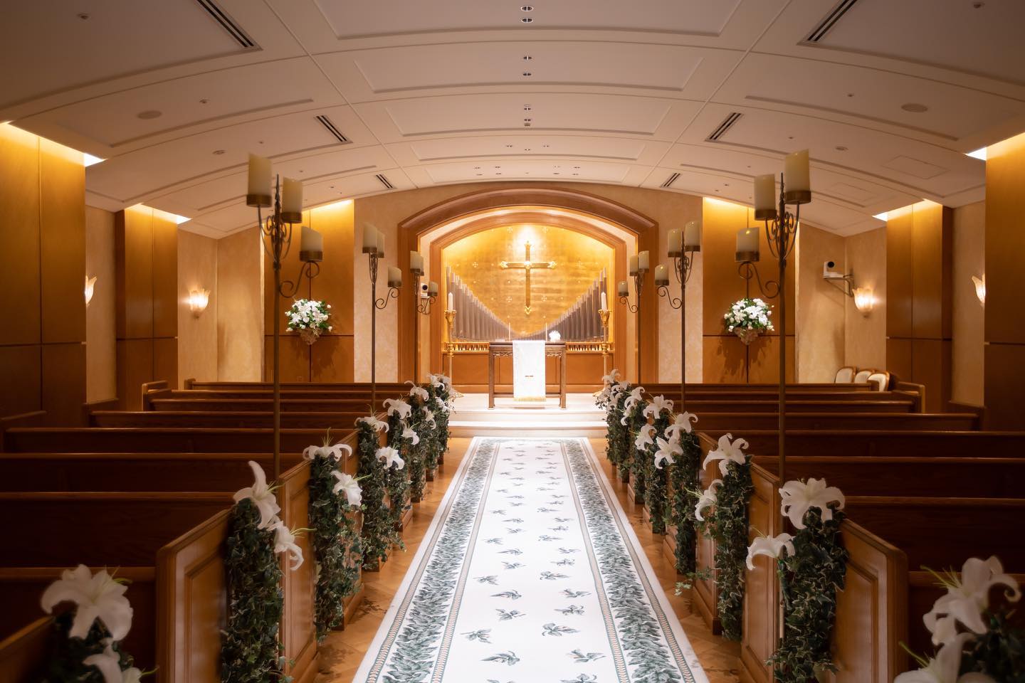 チャペルにて 縦向きも撮ってもらってるんですが、 横の方がチャペル全体が見えて好きなので こちらを採用します💁🏻♀️ ロイパのチャペル、温かみがあって 百合の香りがして良いですよね💕 私の中で王道のチャペルです⛪️