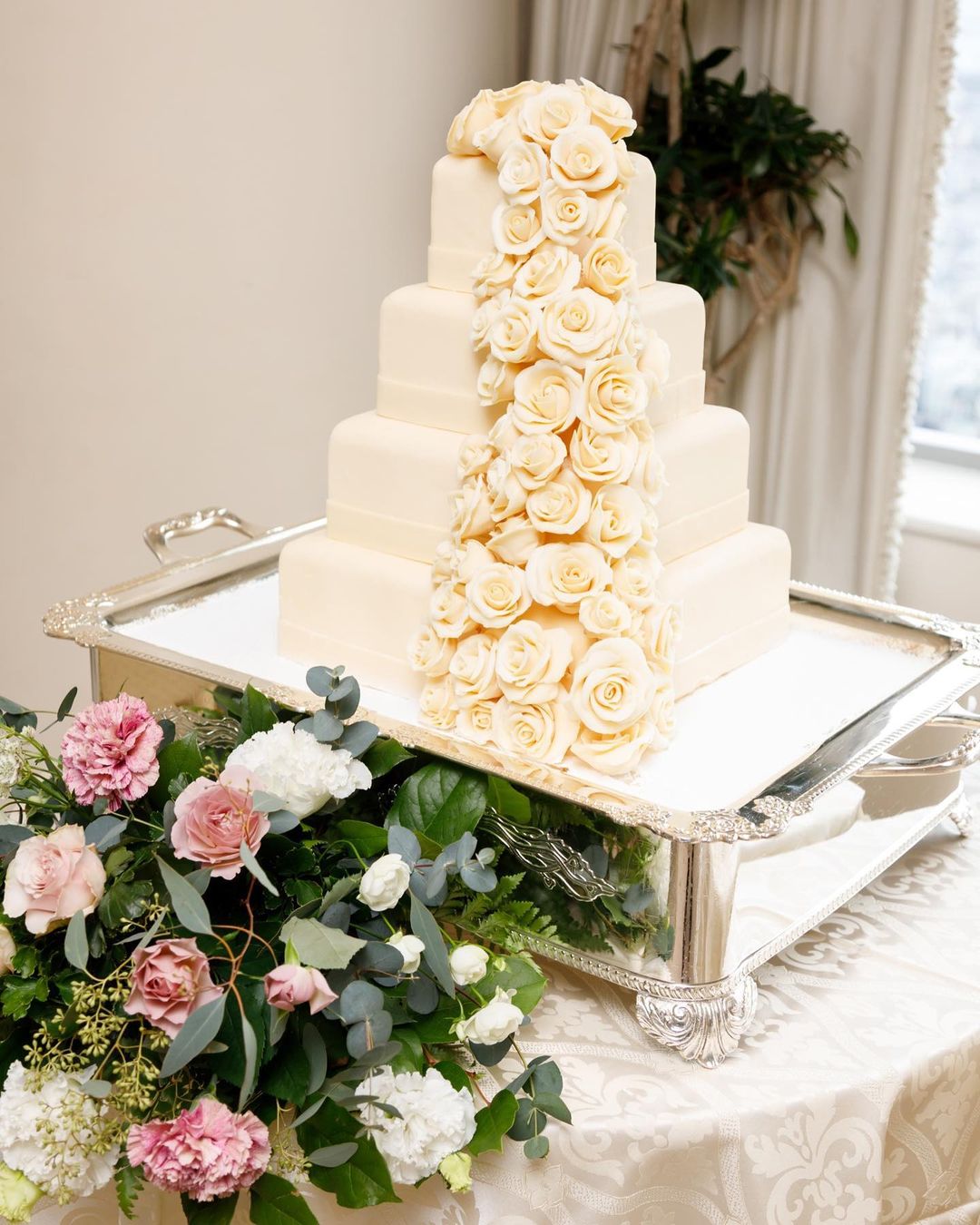披露宴のウェディングケーキは 基本プランに入っているこちらにしました🍰 エレガントなバラが素敵すぎる🌹✨✨ 最初はどのケーキも可愛くて 全然決められなかったですが 今となってはこれしか考えられないです🤣💕 イミテーションだけど、 本物のホワイトチョコケーキみたいで美味しそう🤤 披露宴入場前からケーキは置いてあったので ゲストが近くに見に来てたみたいです😋 この装花とテーブルクロスとの組合わせがお気に入りすぎて 社用携帯の待ち受けにしています😂❤︎