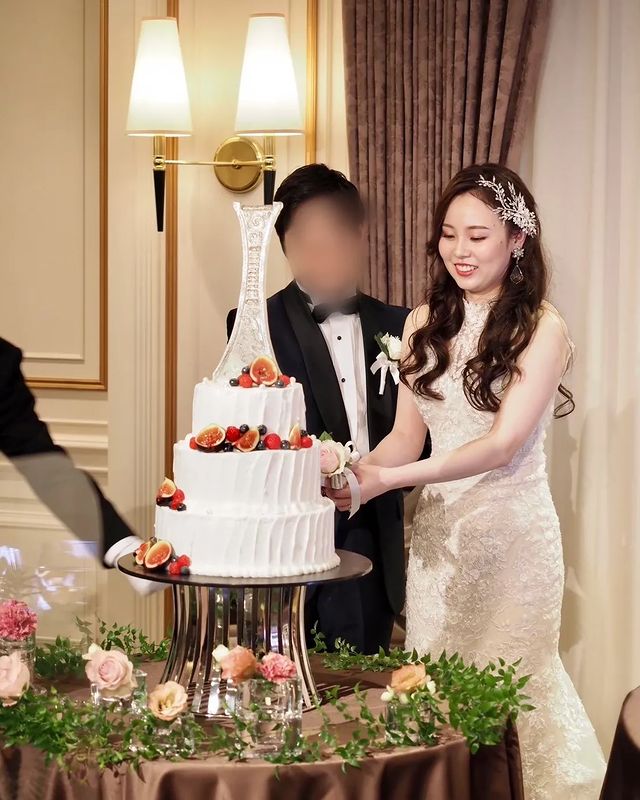 ロイパのケーキ、イミテーションかと思ってたらちゃんと生クリームでした! ケーキにこだわりがなかったので式場サンプルの中からランドマークタワーの飴細工が載ったこちらのケーキに。 サンプルでは真っ白なマカロン+アラザンでしたが 私達はフルーツに変更しました。 ちょっとオシャレにいちじくとベリーでまとめてもらいました🤭 ケーキは契約特典でサンプルの中から選べば費用がかからなかったので節約ポイントかな? ※フルーツに変更した分の差額3,000円はかかります